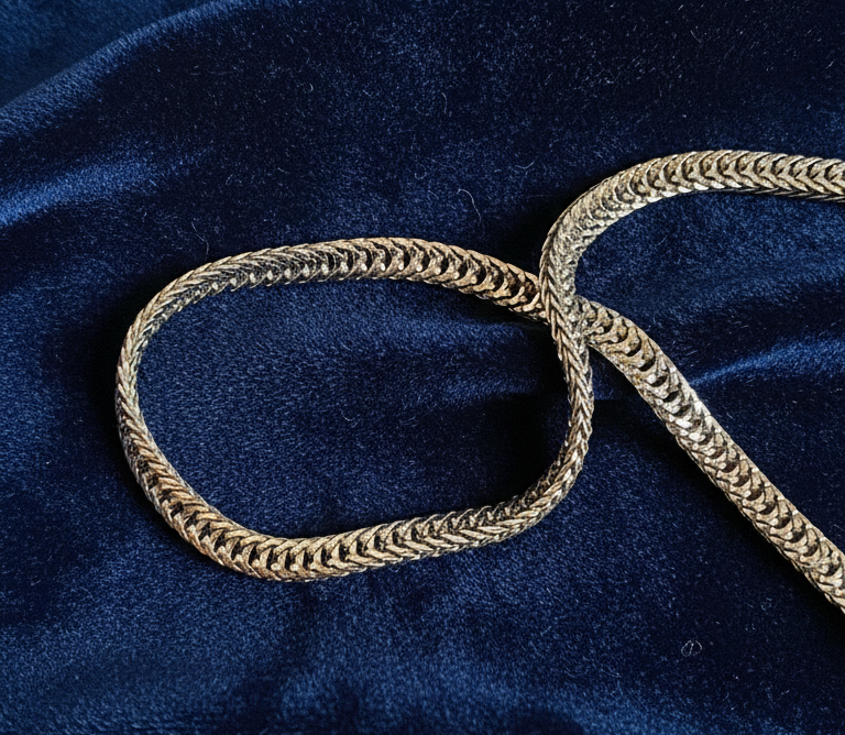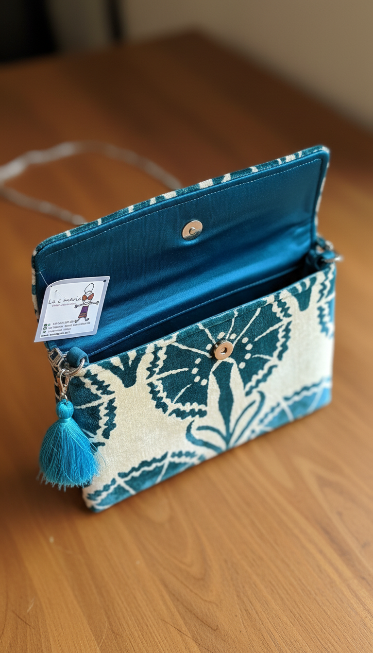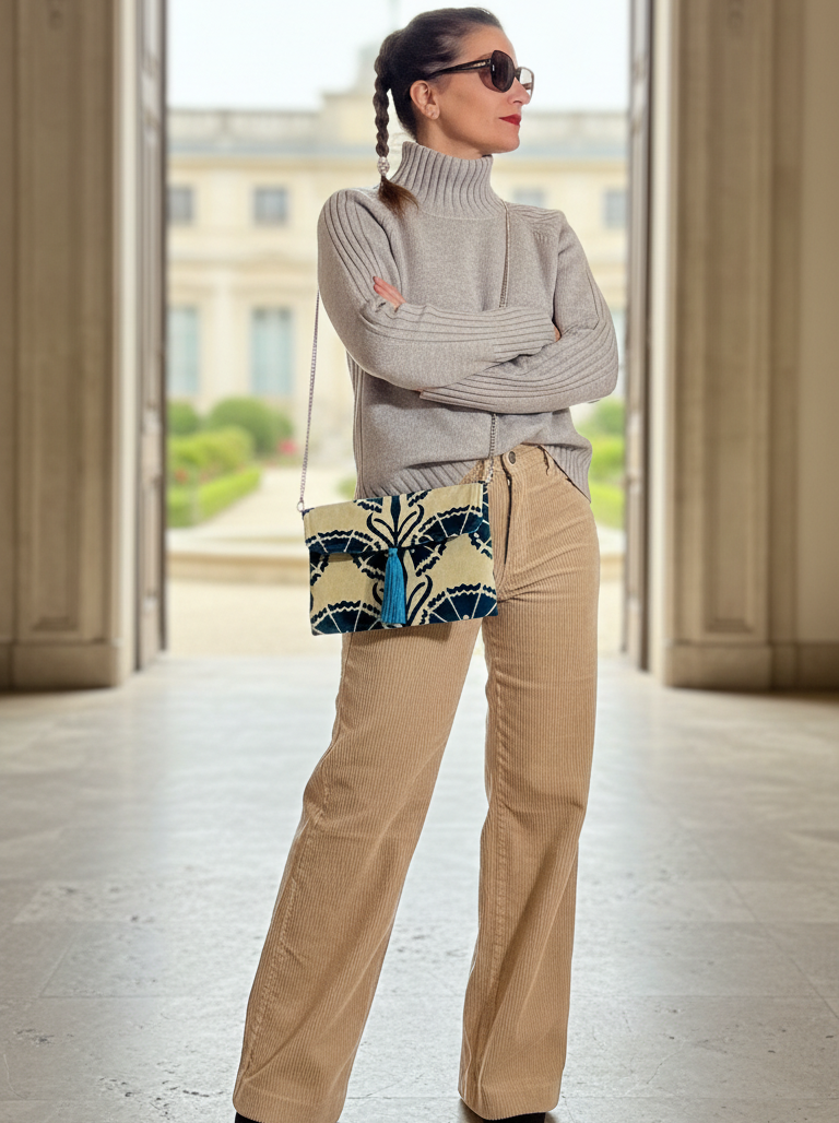 Bolso de terciopelo con diseño geométrico en tonos crema y azul. Lleva borla frontal a juego y cierre de solapa. Interior forrado.