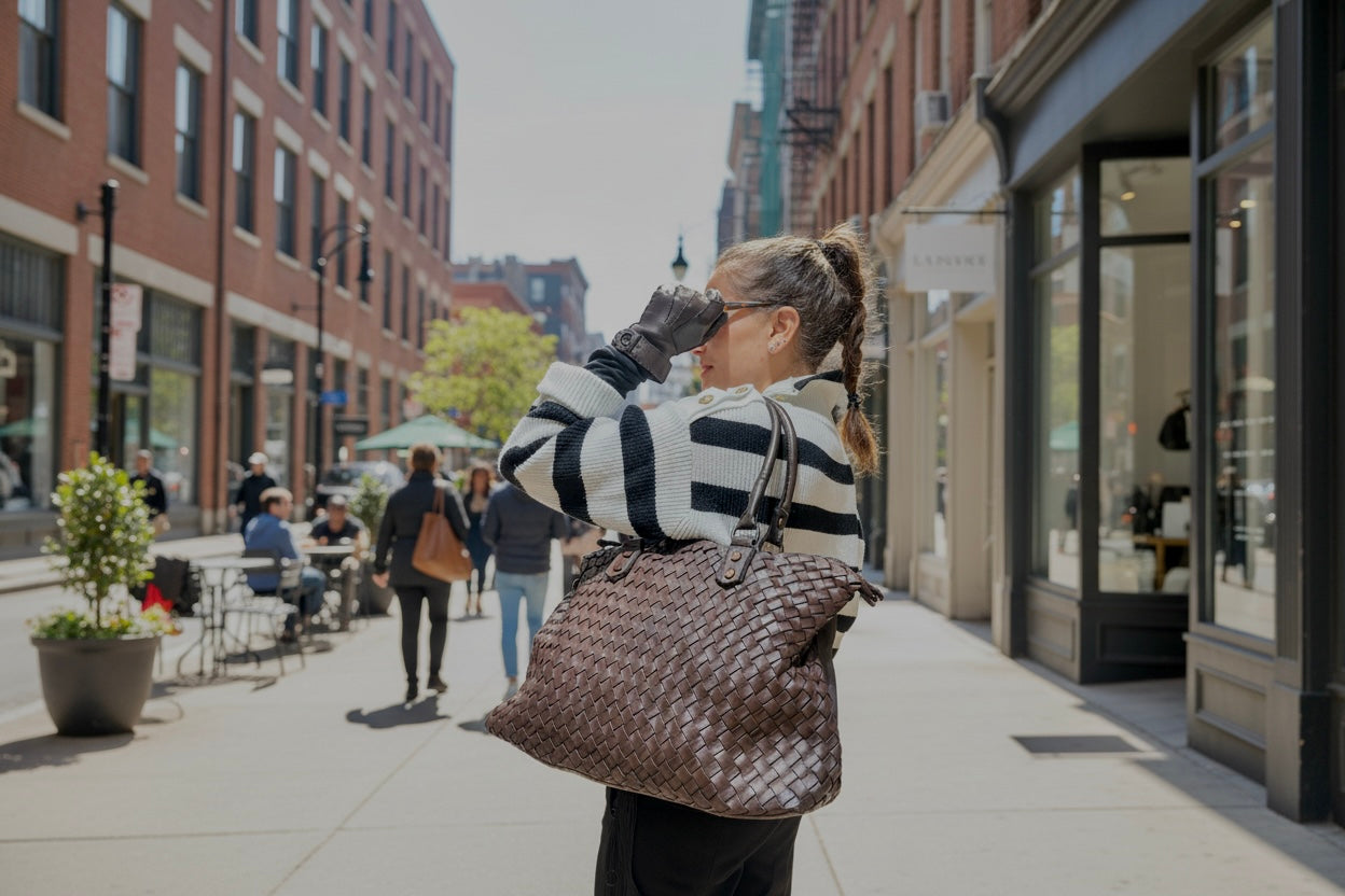 Bolso todoterreno de piel natural trenzada, diseño cómodo y atemporal. Asas de piel y asa extraíble para poder llevarlo al hombro o en la mano. Cierre con cremallera.
