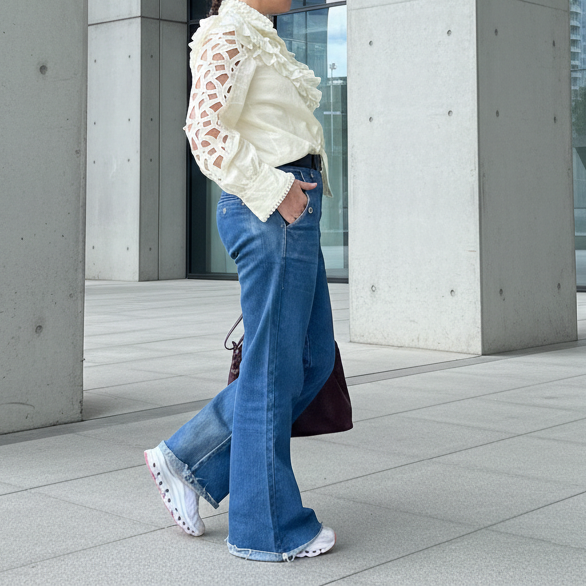Camisa de algodón con cuello subido y volantes frontales en pico. Manga larga con calado bordado y puño ligeramente fruncido. Corte recto, ideal para llevar por dentro o por fuera. Perfecta para combinar con vaqueros,pantalones más arreglado,faldas etc.