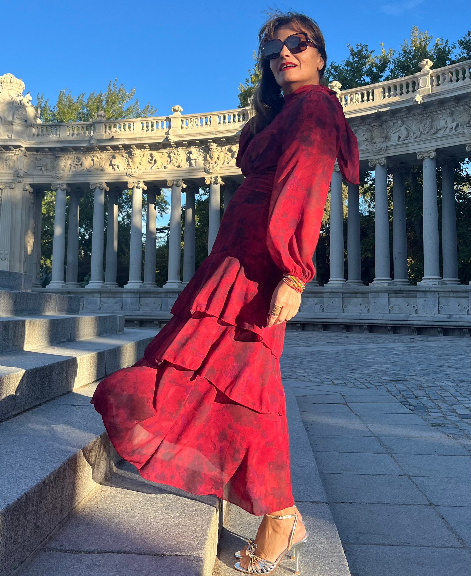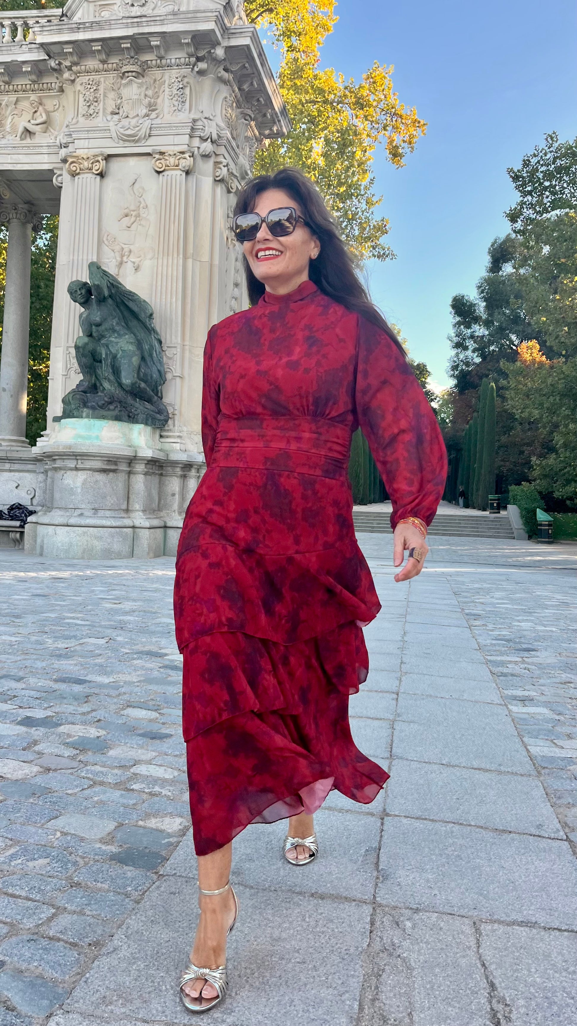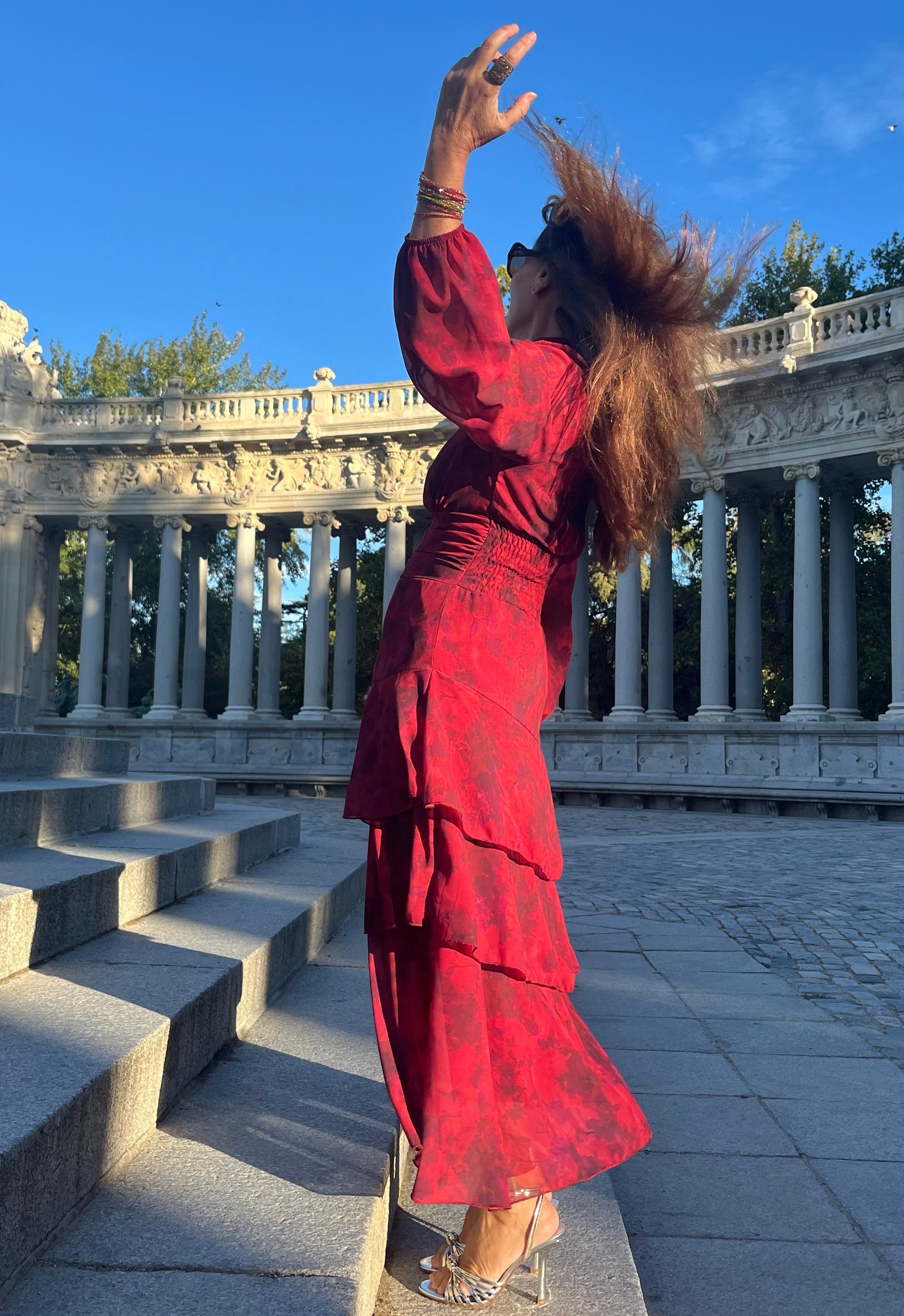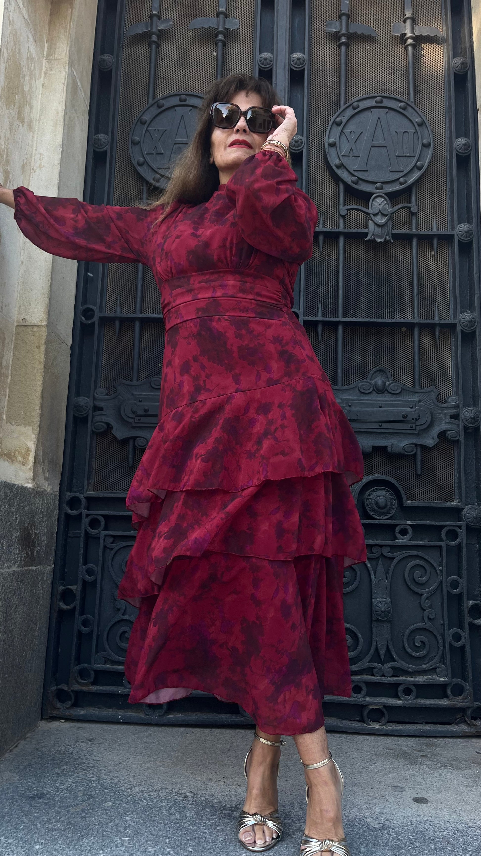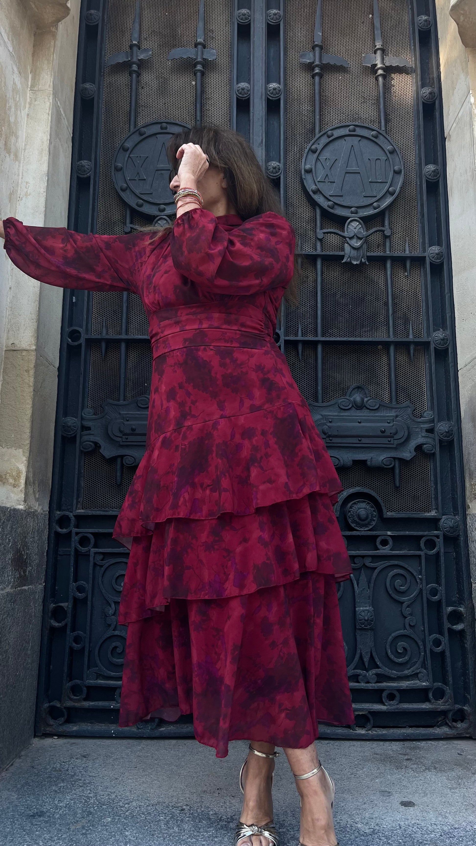 Increíble vestido fluido con fondo burdeos y estampado floral en tonos vino y púrpura. Presenta cuello alto, mangas largas abullonadas y corte entallado en la cintura con un efecto fajín que realza la silueta. La falda, con volantes en capas, aporta movimiento y un aire muy femenino.