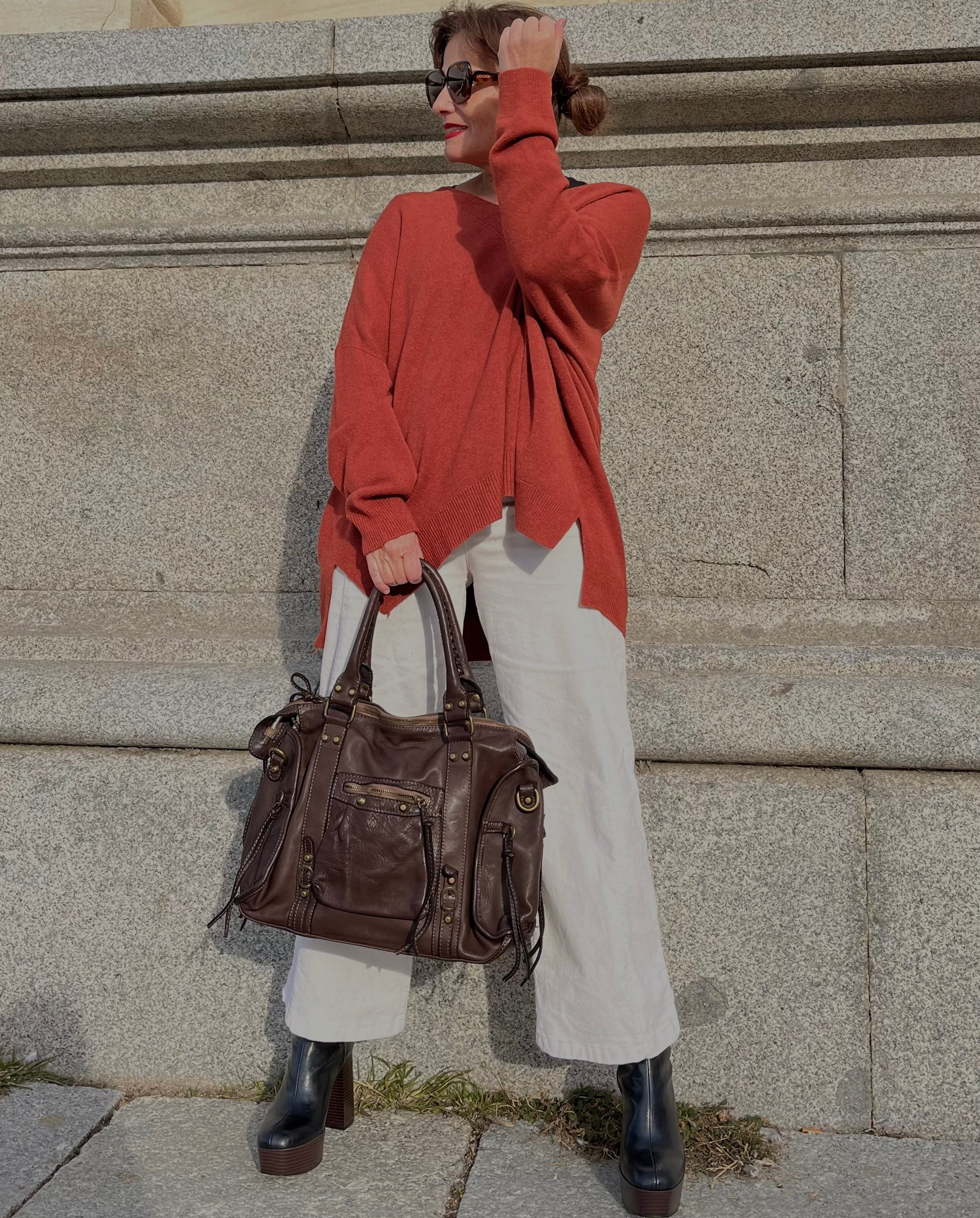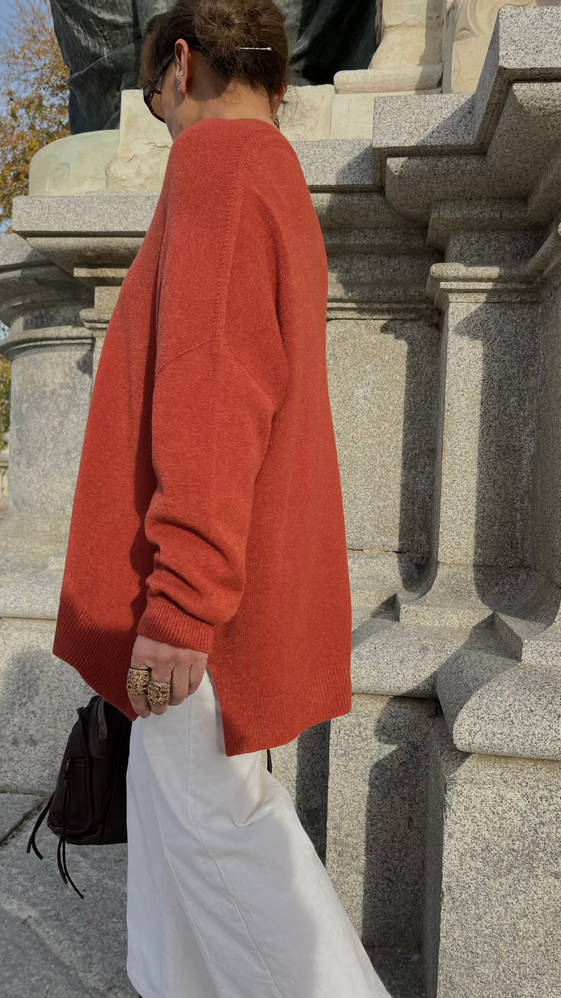 Jersey oversize en color teja, con escote en “V” y caída amplia. Su punto es suave, ligero y muy cómodo para llevar con cualquier look. El color puede sufrir un ligero cambio con la luz del exterior es un poco más oscuro. Su color es teja prácticamente como la foto de la percha interior.
