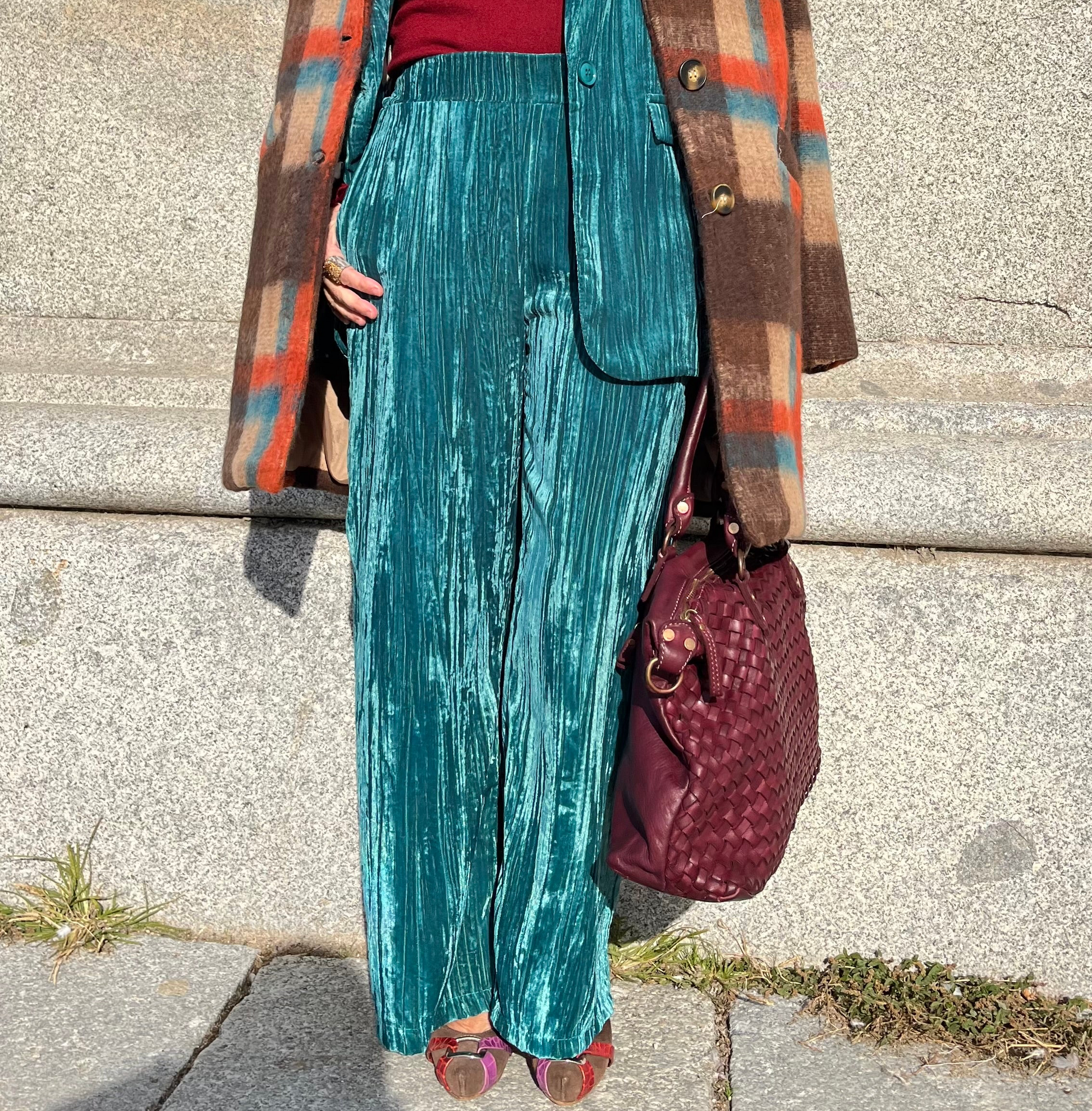 Pantalón de terciopelo plisado en color verde petróleo, con caída fluida y tacto suave. Cintura elástica cómoda, tiro medio y pierna ancha que estiliza bastante. Es ligero, no pesa nada y queda perfecto tanto con su chaqueta a juego como con jerséis más básicos.