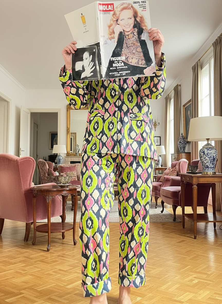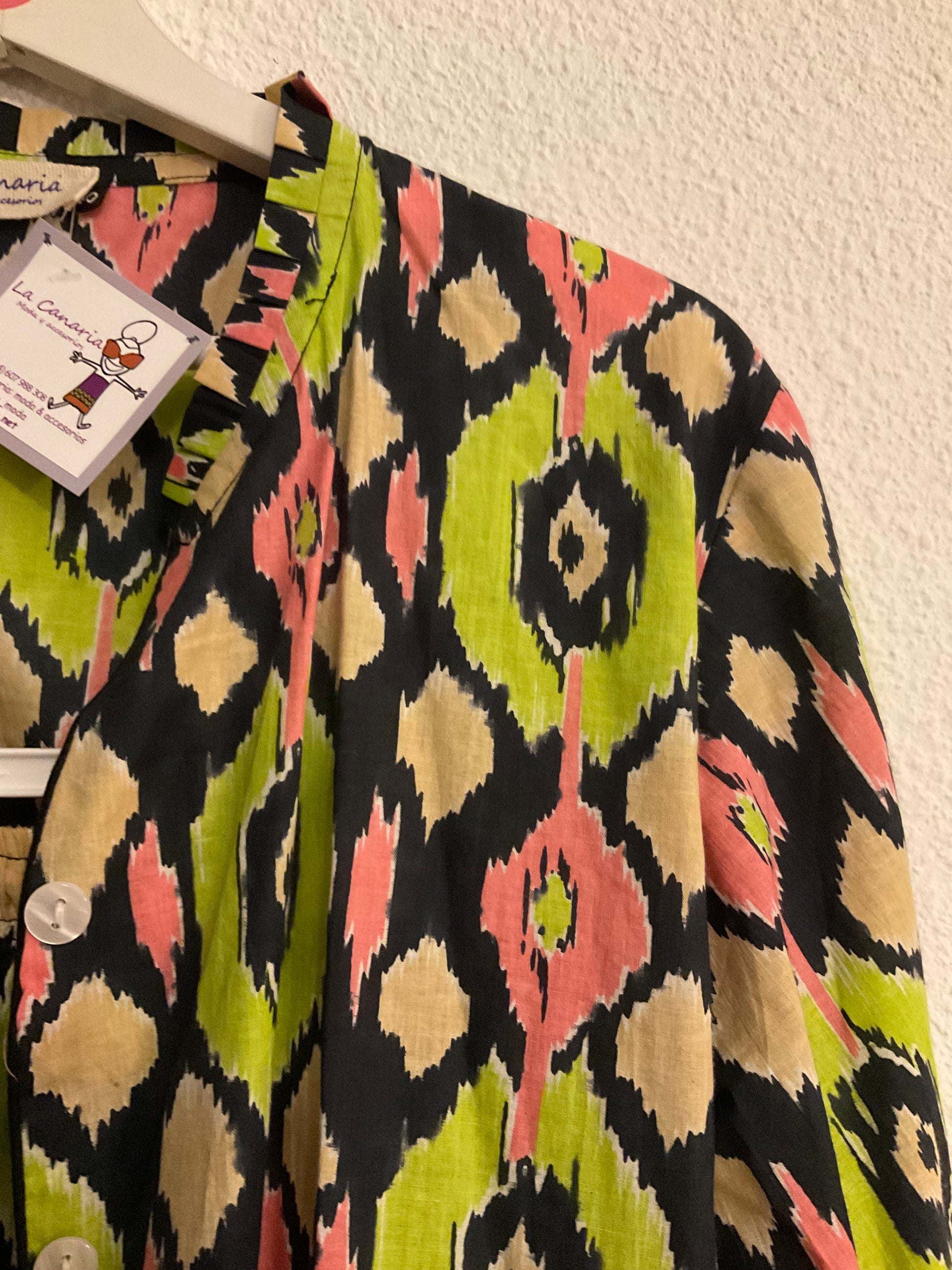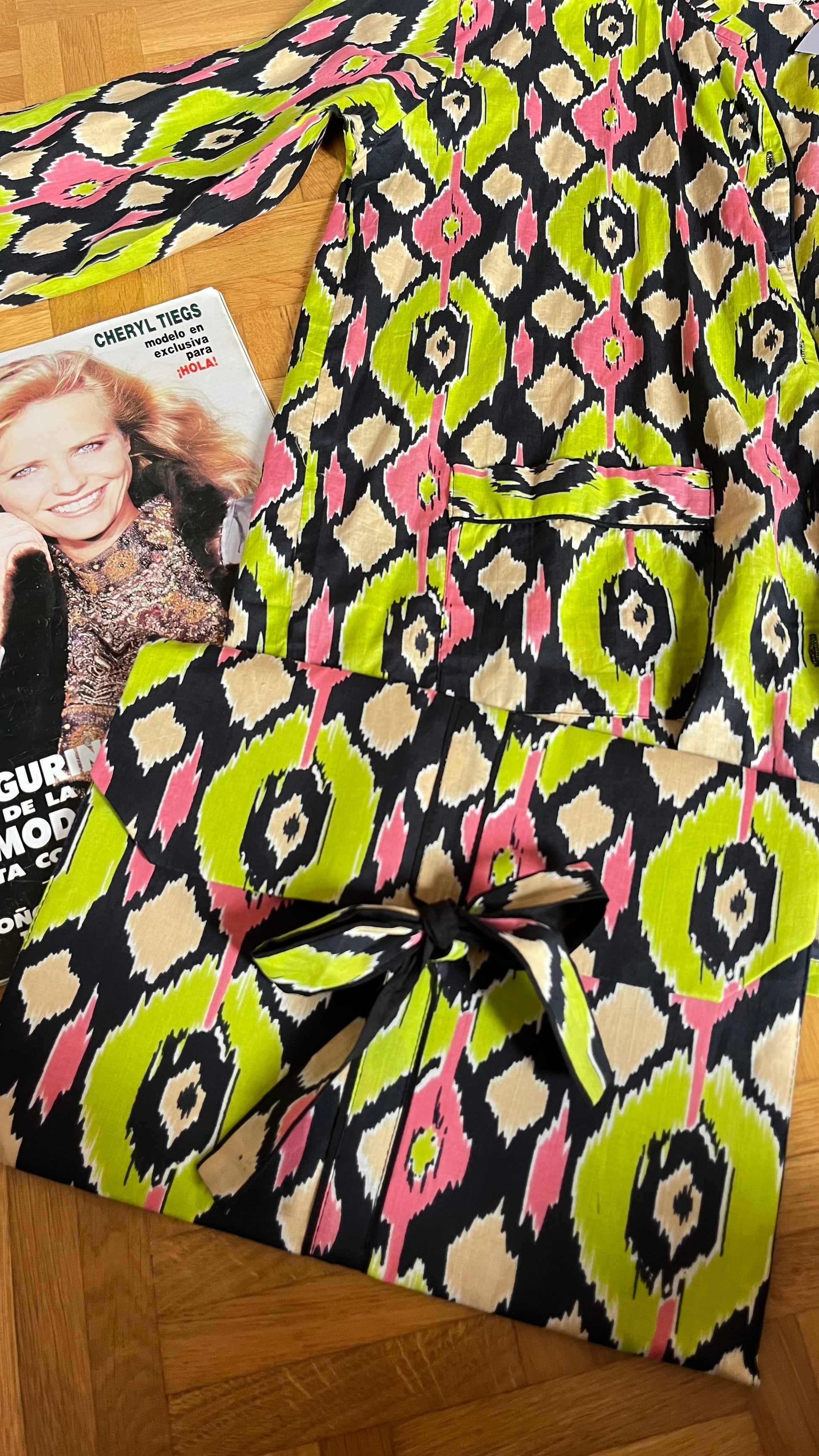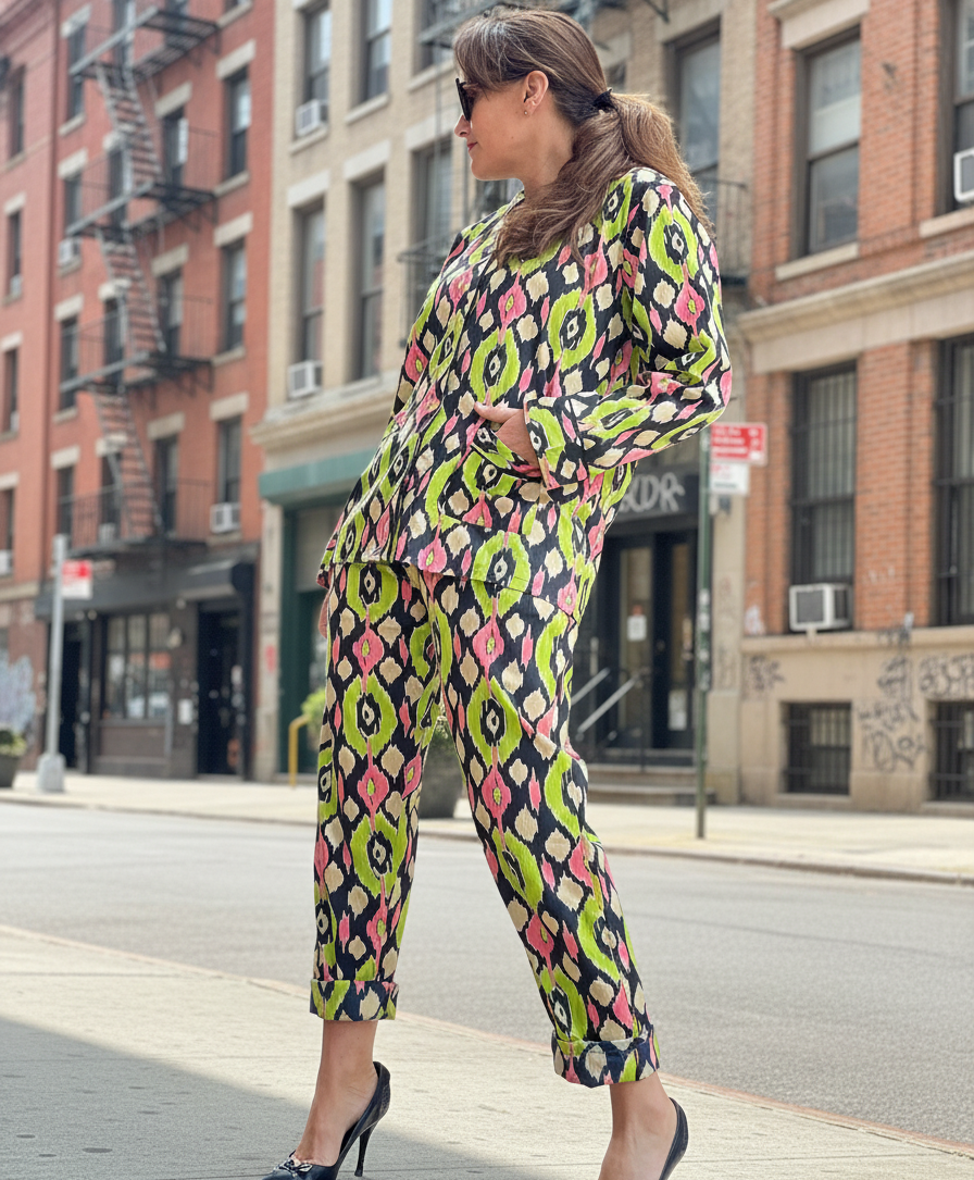 Set dos piezas 100% algodón con estampado ikat en tonos lima, rosa y negro.