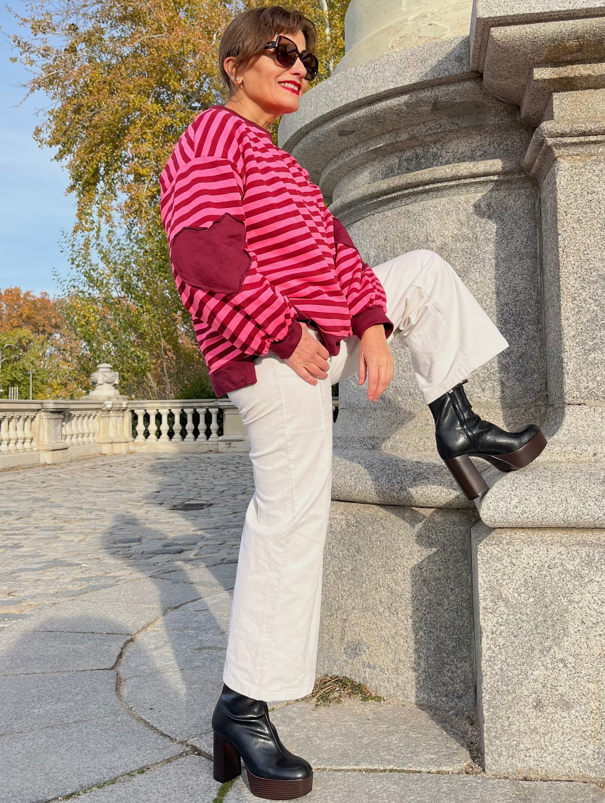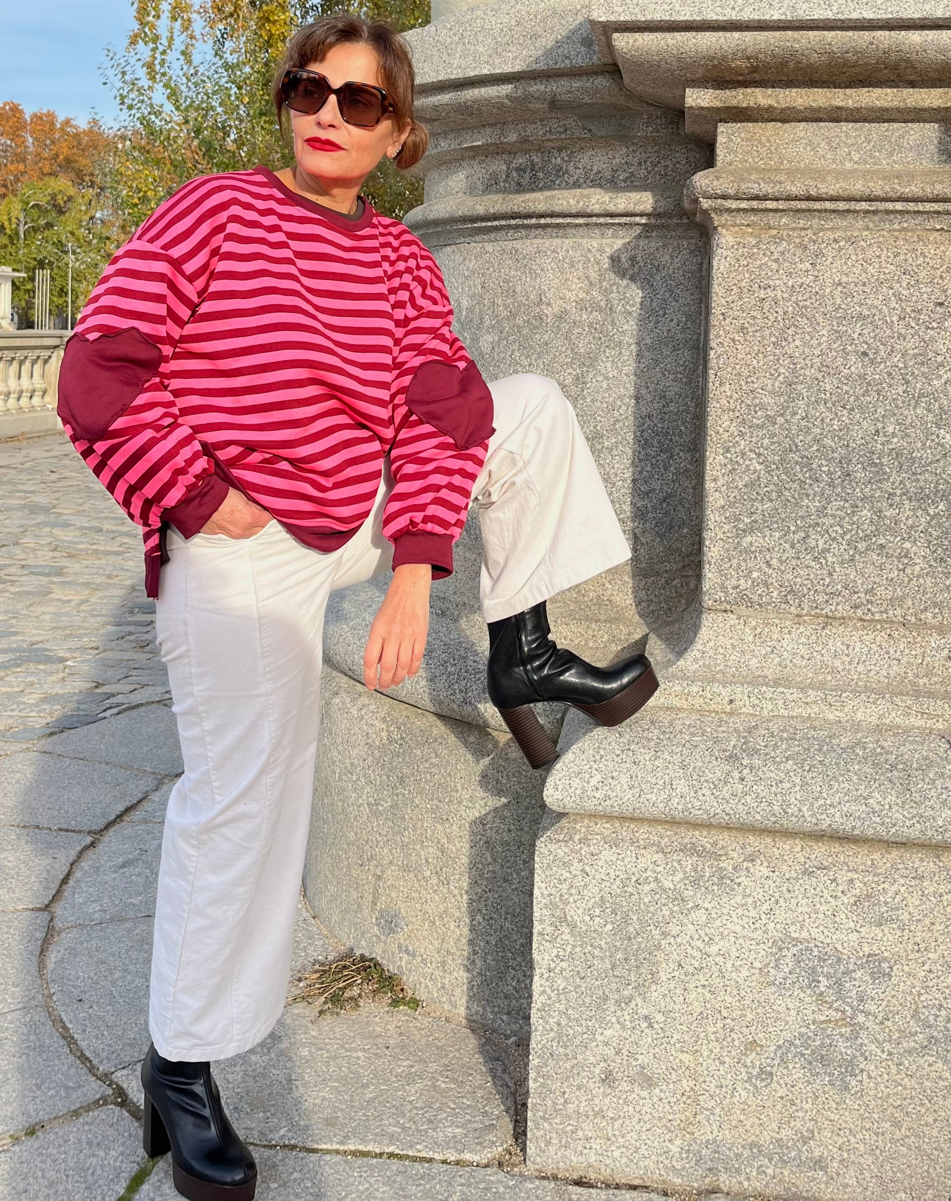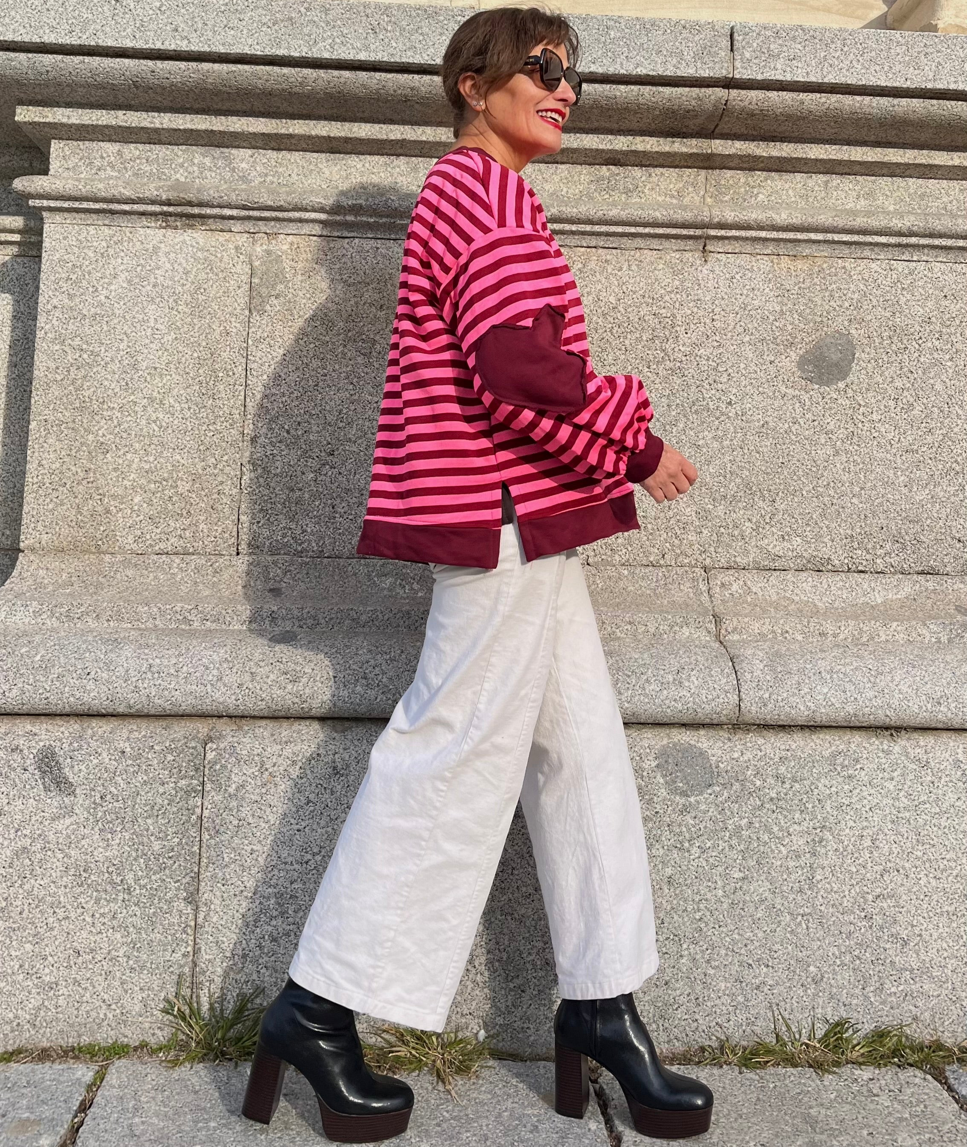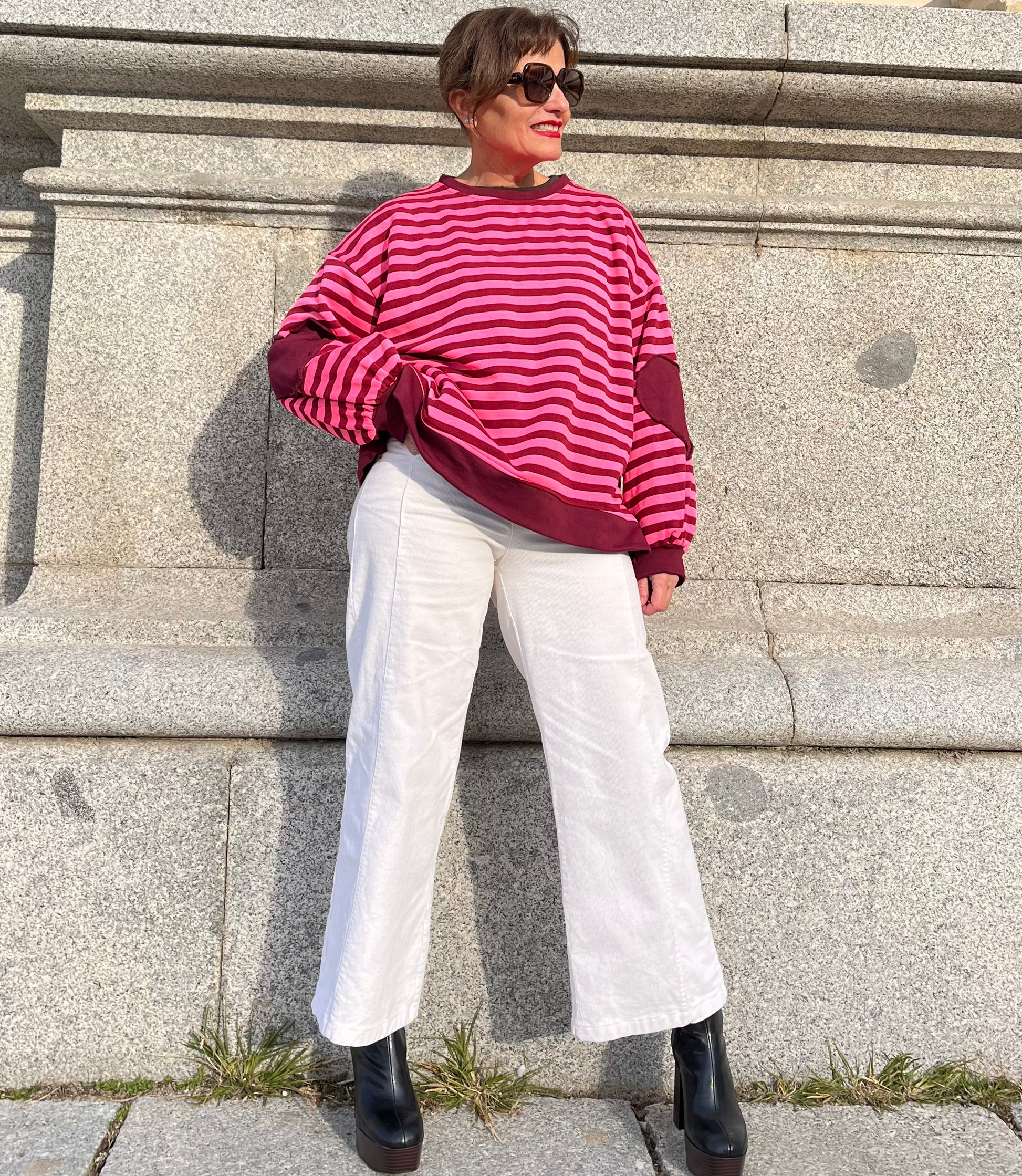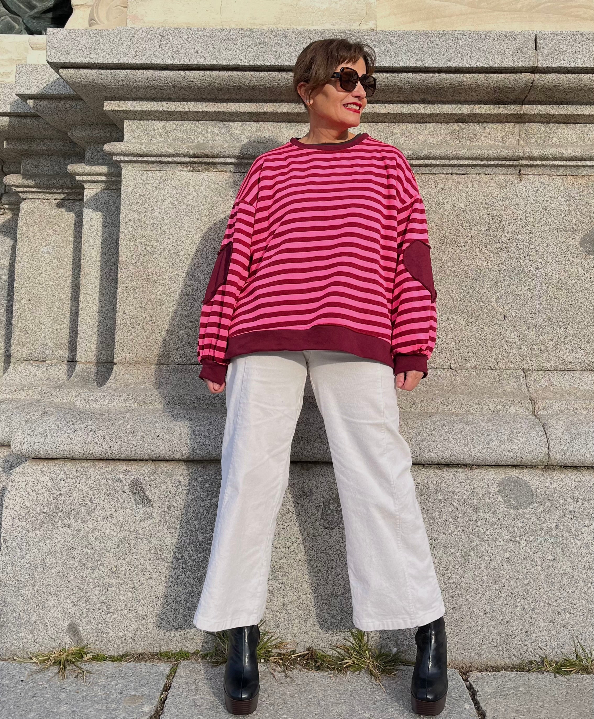 Sudadera unisex de rayas en rosa y burdeos, con interior efecto peluche y corte amplio. Coderas en forma de corazón en tono burdeos. Bajo recto y aberturas laterales que sienta increíble.