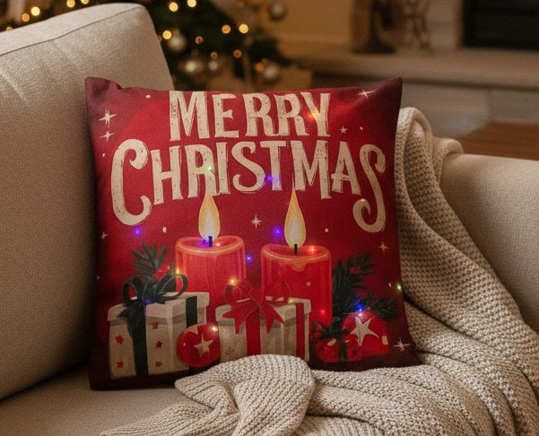Cojín decorativo con estampado navideño y luces LED integradas, ideal para crear un ambiente cálido y diferente.Incluye funda,pilas  y relleno.
