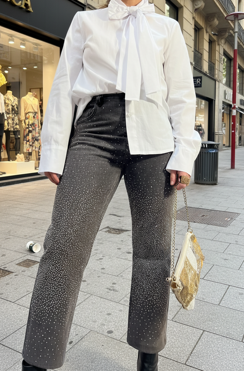 Camisa blanca de corte clásico con lazada frontal tipo “bow tie blouse” (también llamada cuello pussy bow, tendencia total esta temporada).