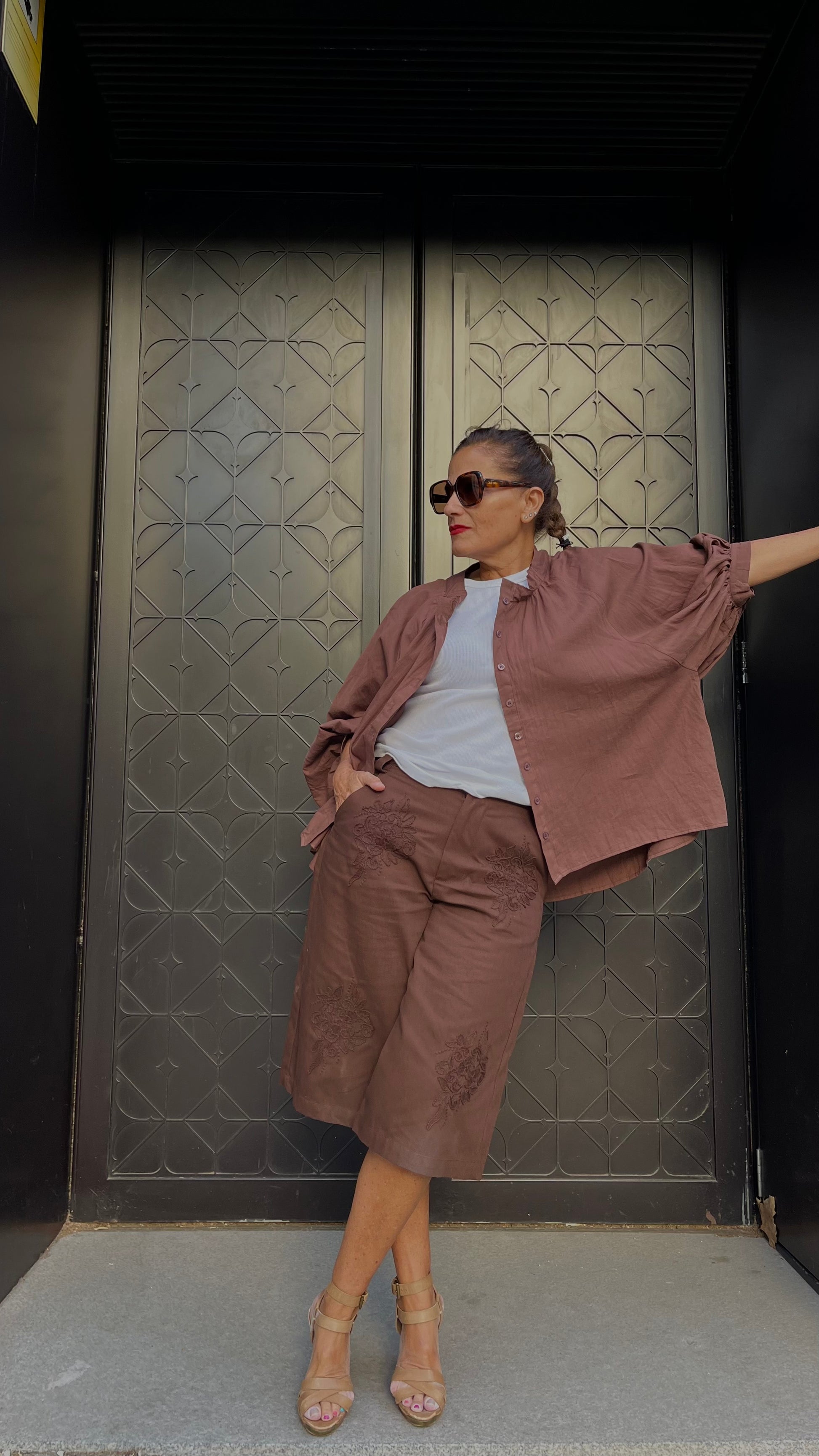 Bermudas de algodón 90% en tono marrón chocolate, talle alto y corte recto hasta la rodilla. Detalle de bordados florales tono sobre tono. Diseño cómodo y versátil, ideal para combinar con camisas o camisetas.Bolsillos traseros.