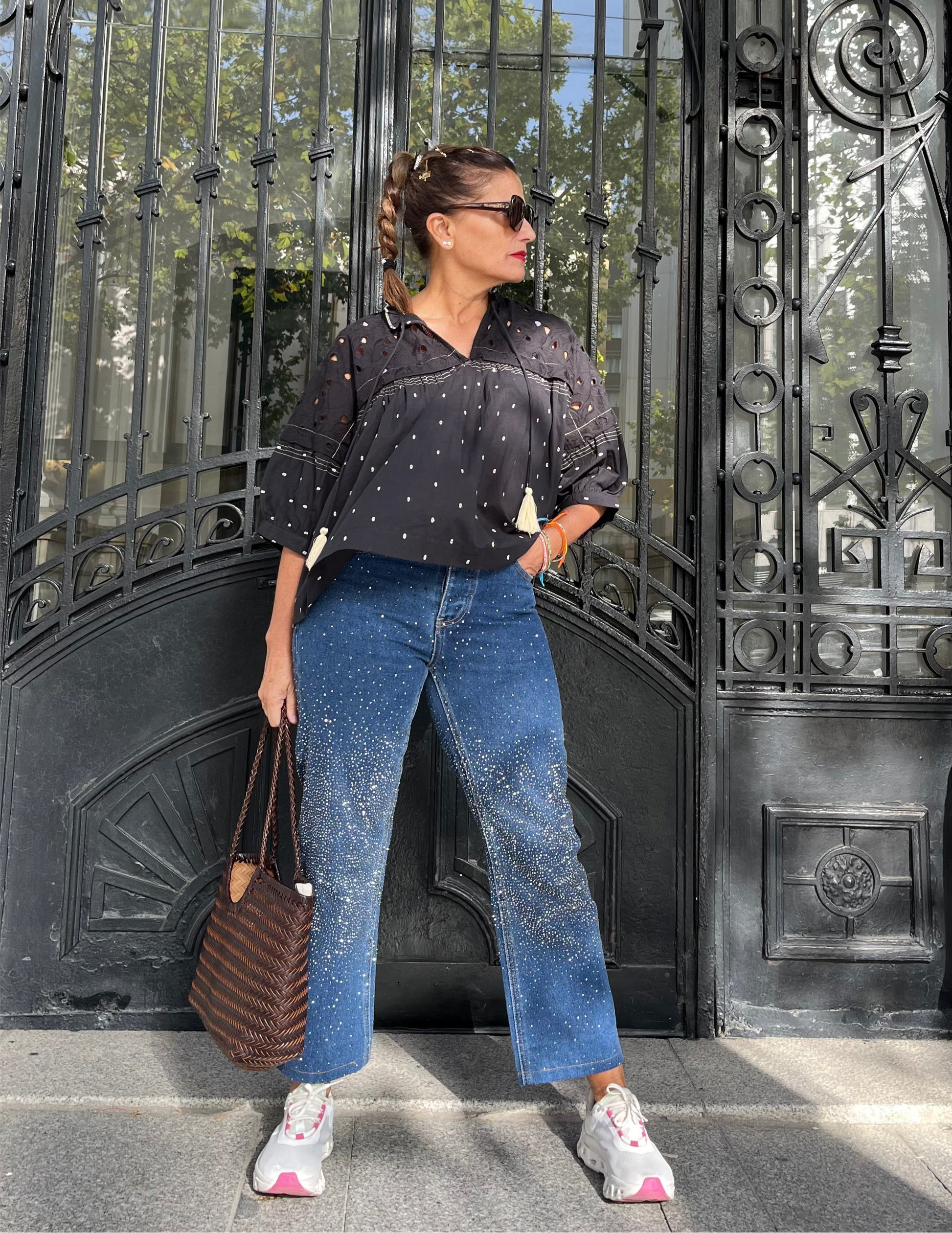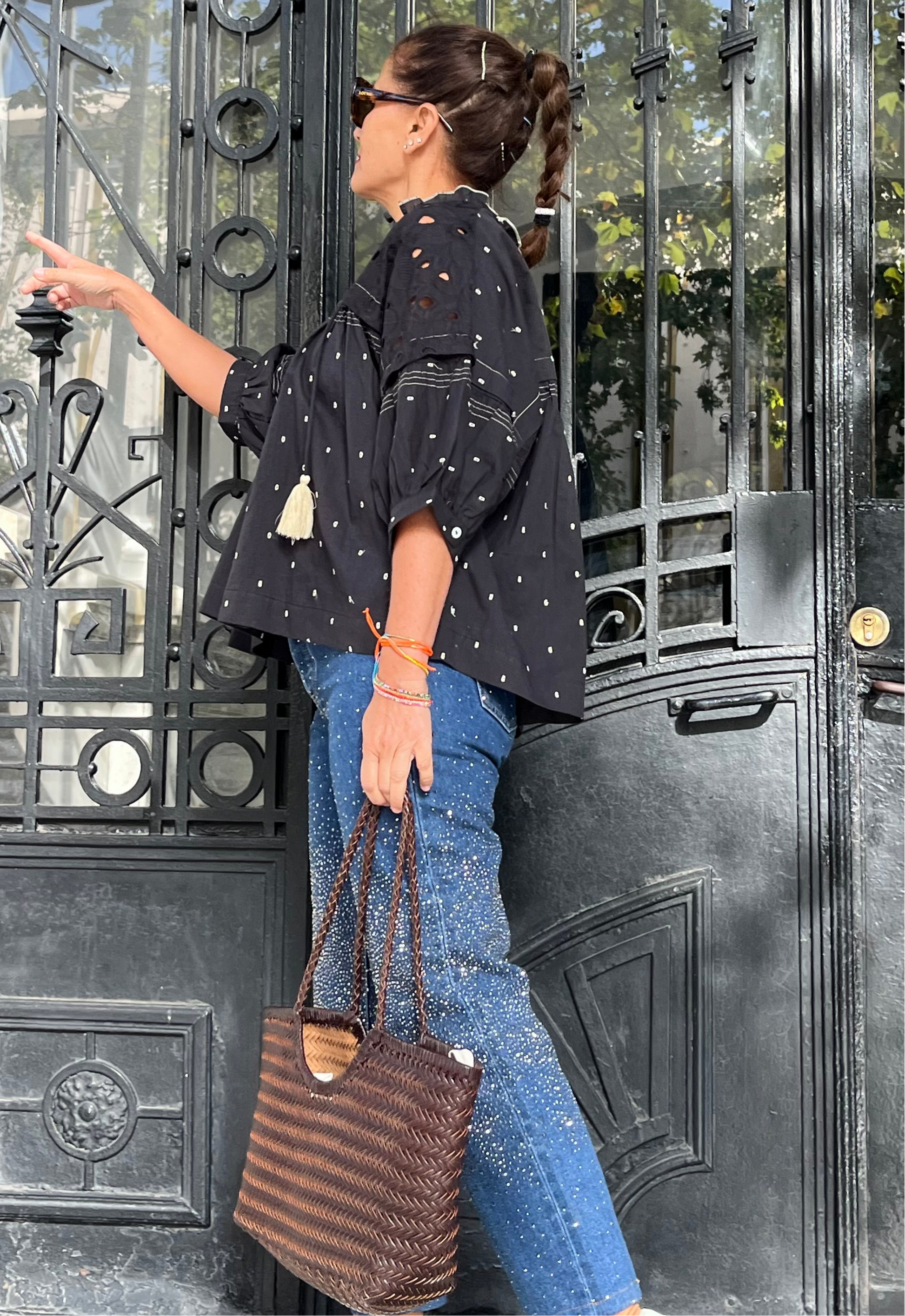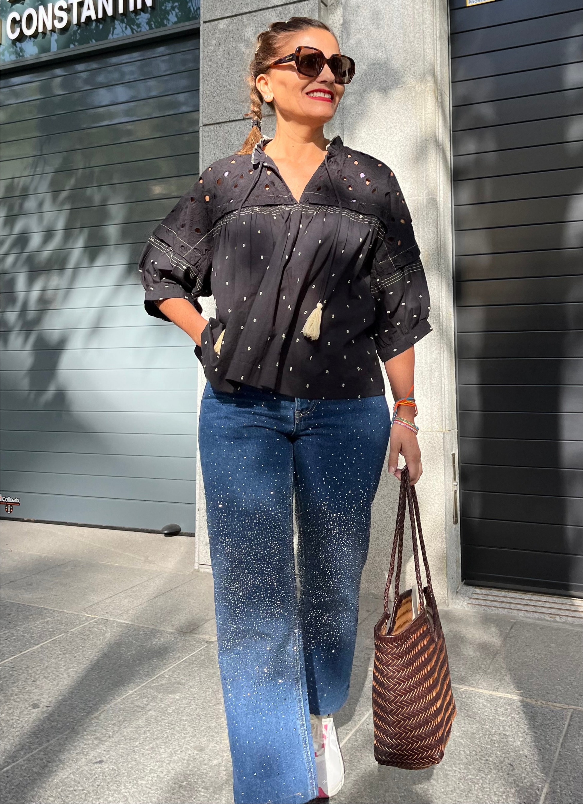 Blusa de algodón con bordados. Diseño con canesú calado y bordado floral en la parte superior.