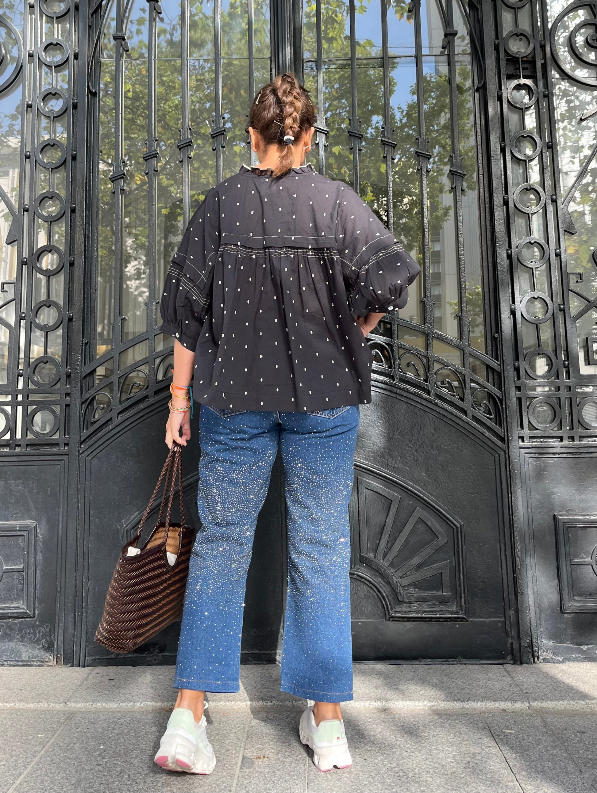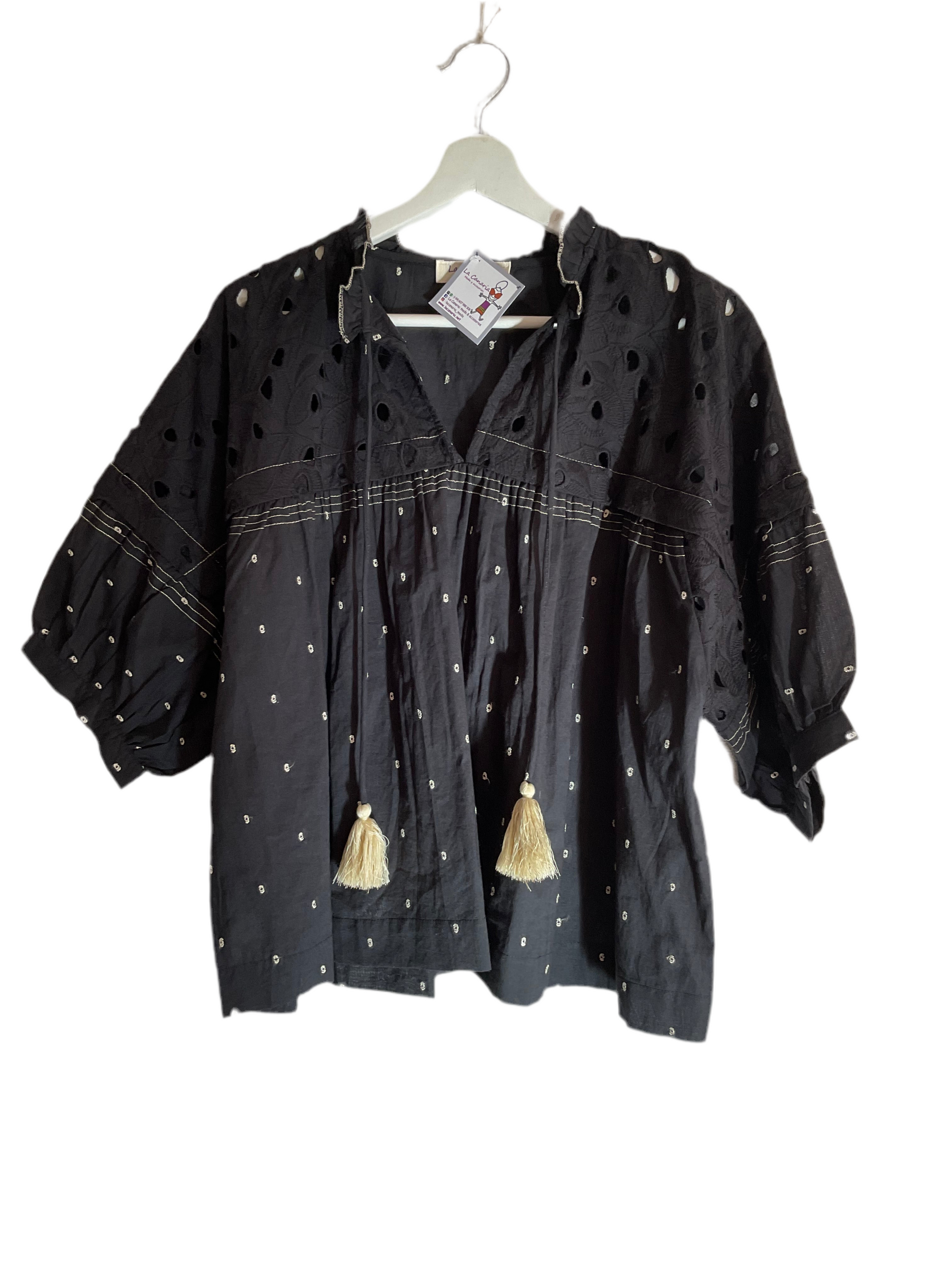 Cuello mao con mini volante y escote en pico con cordones terminados en borlas. Manga francesa abullonada con detalle de jaretas. Espalda suelta.