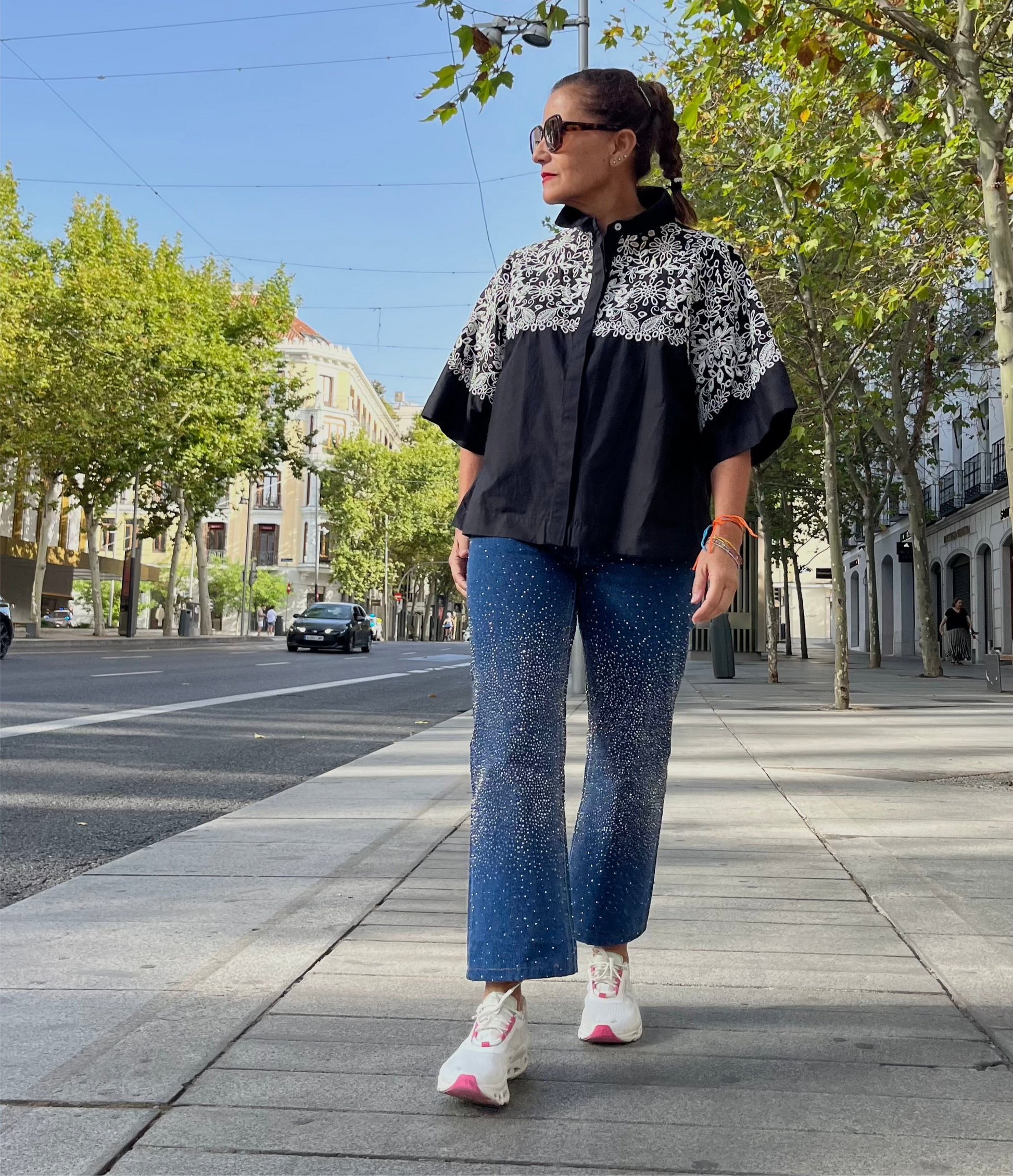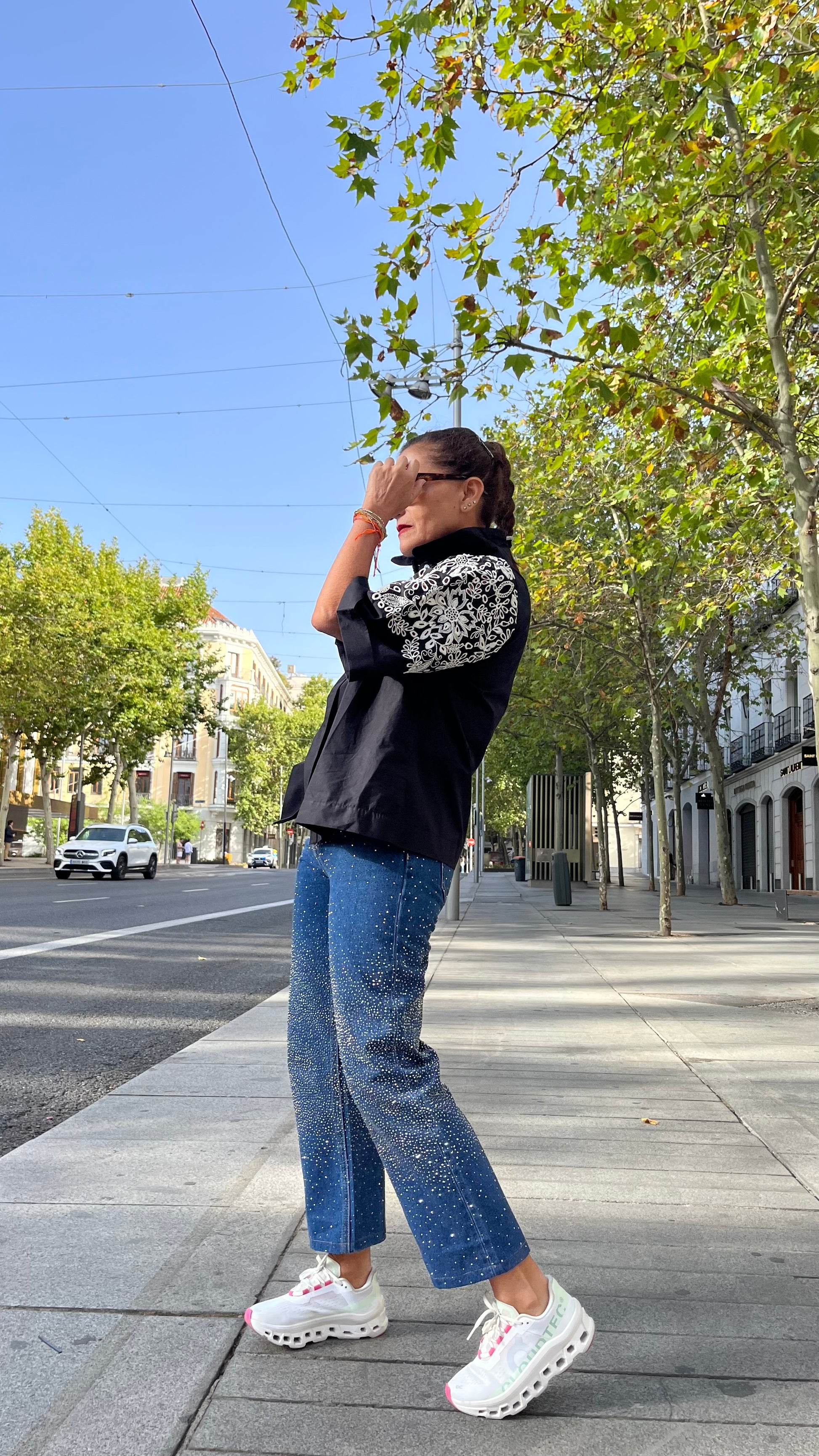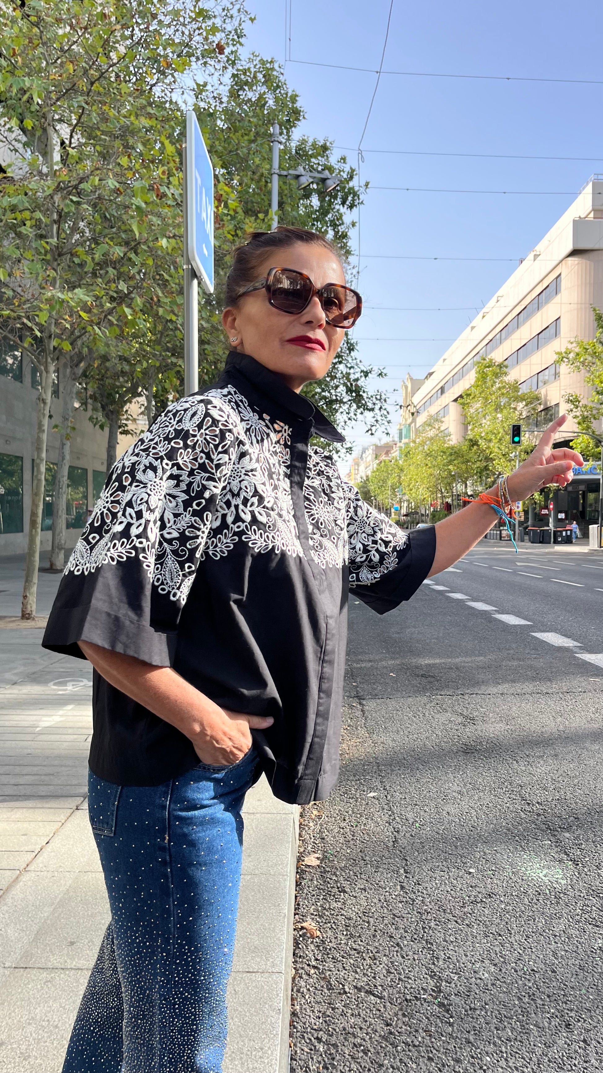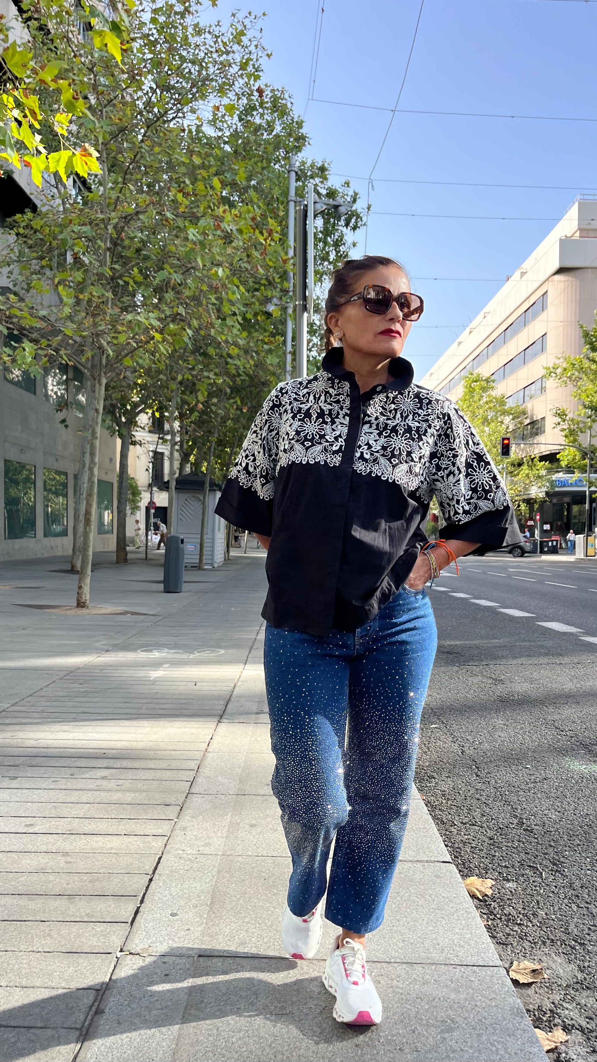 Camisa de algodón, fabricada en India. Diseño en color negro con bordado floral en contraste en blanco en la parte superior y mangas. Cuello solapa con cierre de botones ocultos en la parte frontal. Manga amplia al codo con acabado recto. Corte suelto y cómodo, ideal para combinar tanto con jeans como con pantalones / faldas etc…