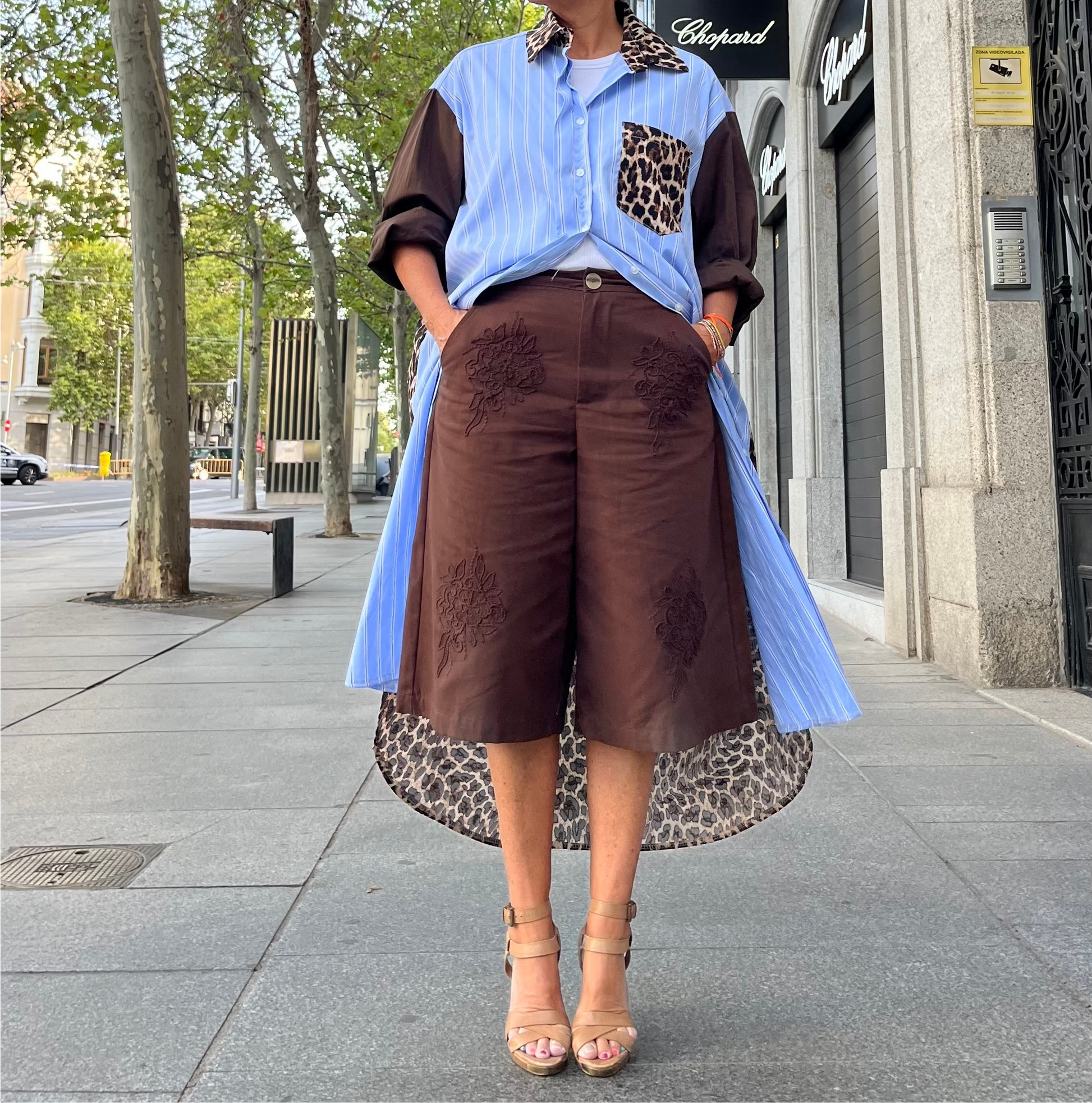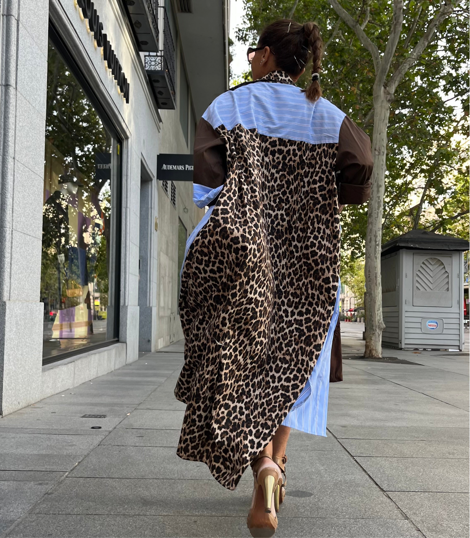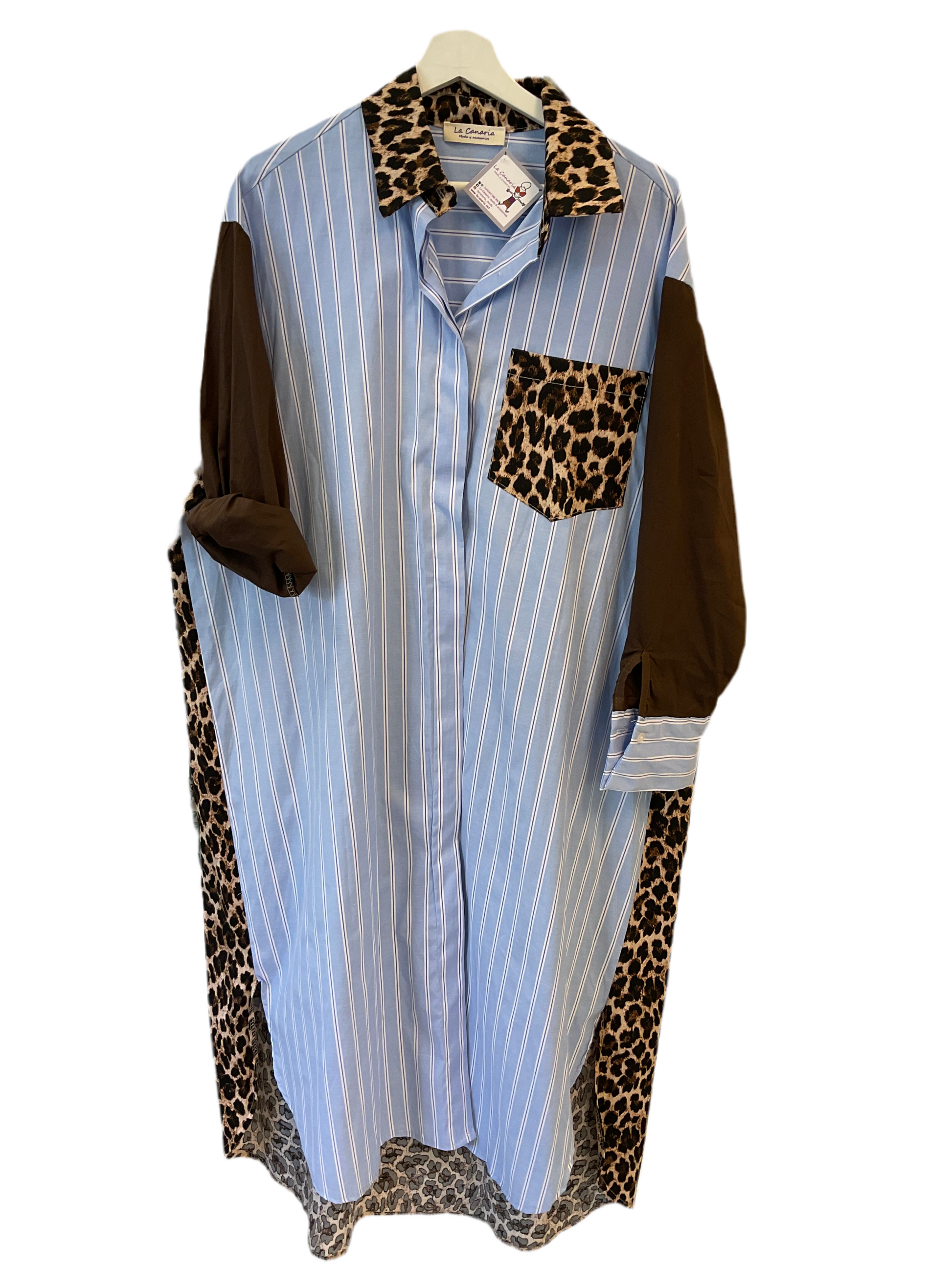 Camisa larga oversize 100% algodón. Parte delantera azul claro de rayas blancas, bolsillo y cuello con estampado animal print. Mangas anchas marrones. Espalda con estampado de leopardo. Cierre frontal con botones.