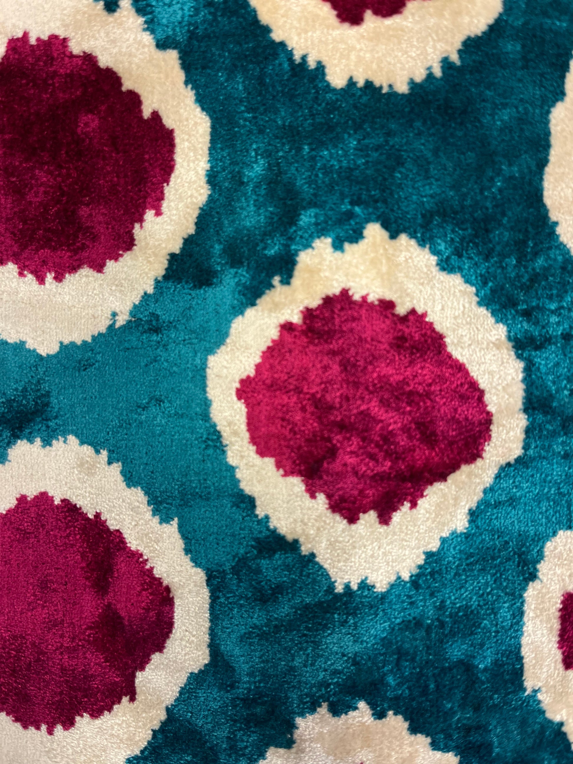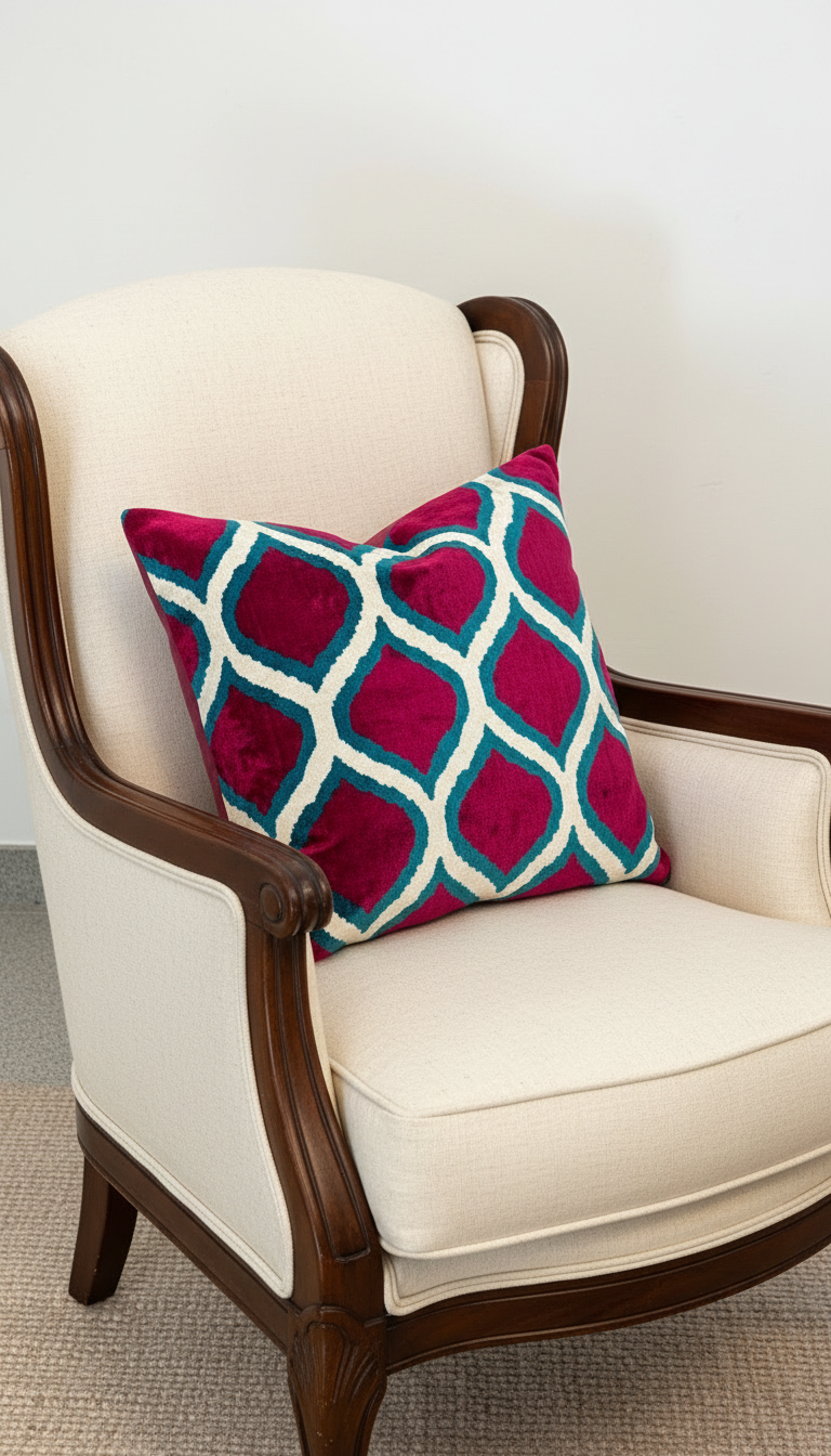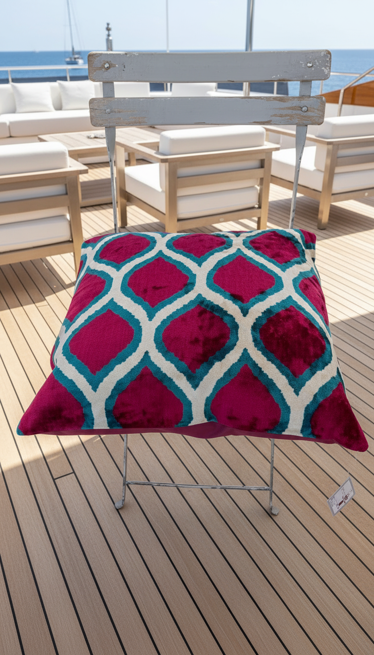 Cojines de 50x50 con delantero en terciopelo y estampados en tonos burdeos, aguamarina y crudo, disponibles en dibujo geométrico o circular.