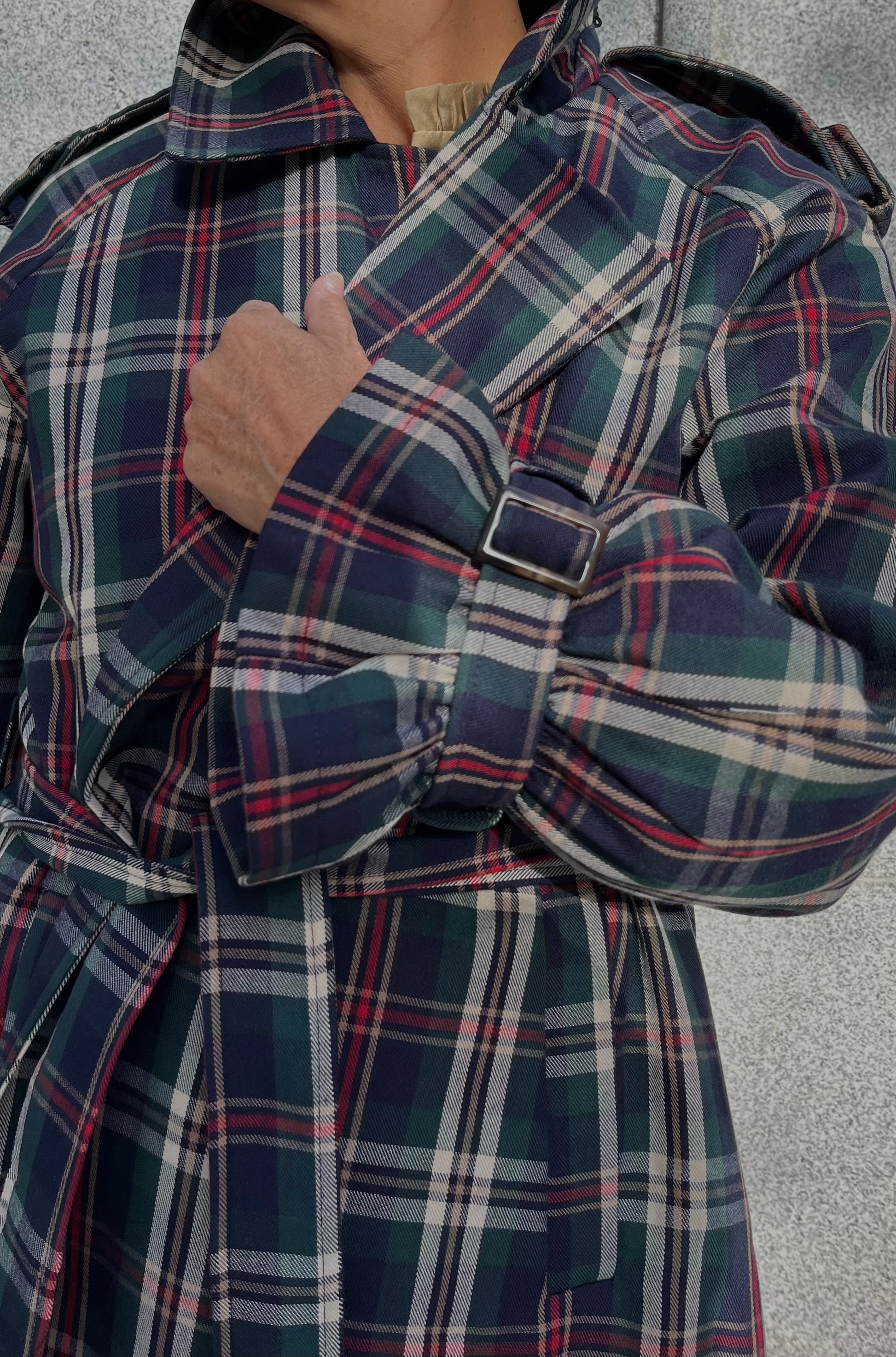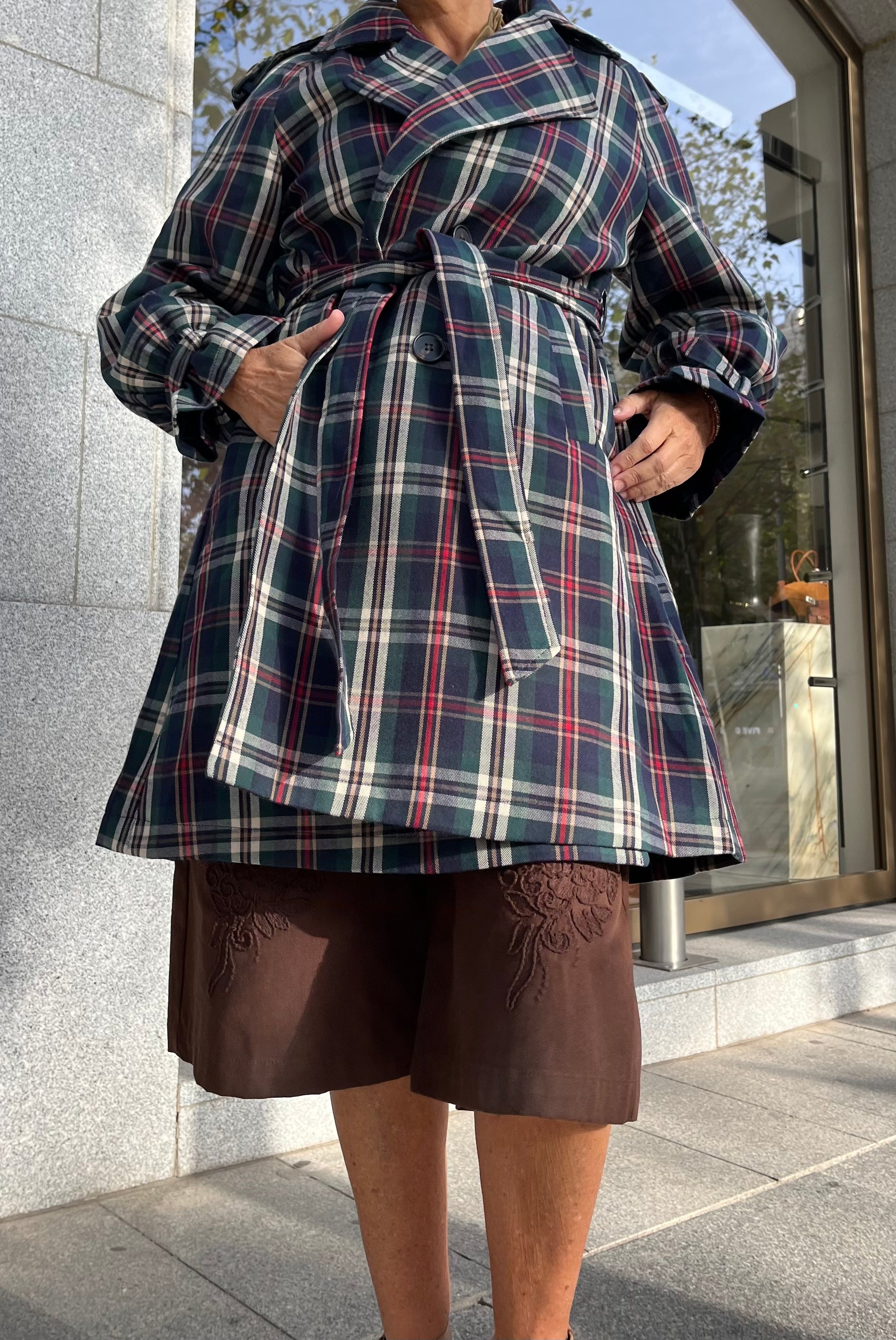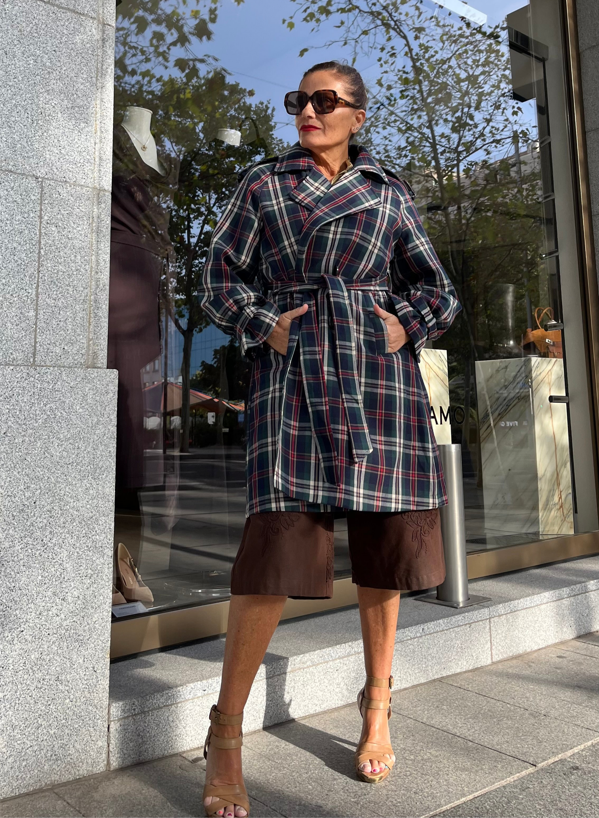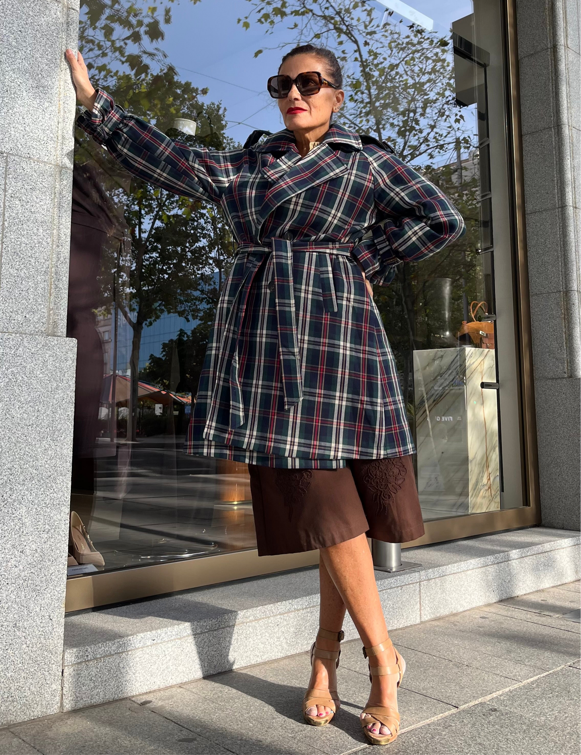 Una prenda versátil que combina el aire atemporal del trench con el estampado tartán de temporada, ideal para llevar tanto con vaqueros como con looks más arreglados.