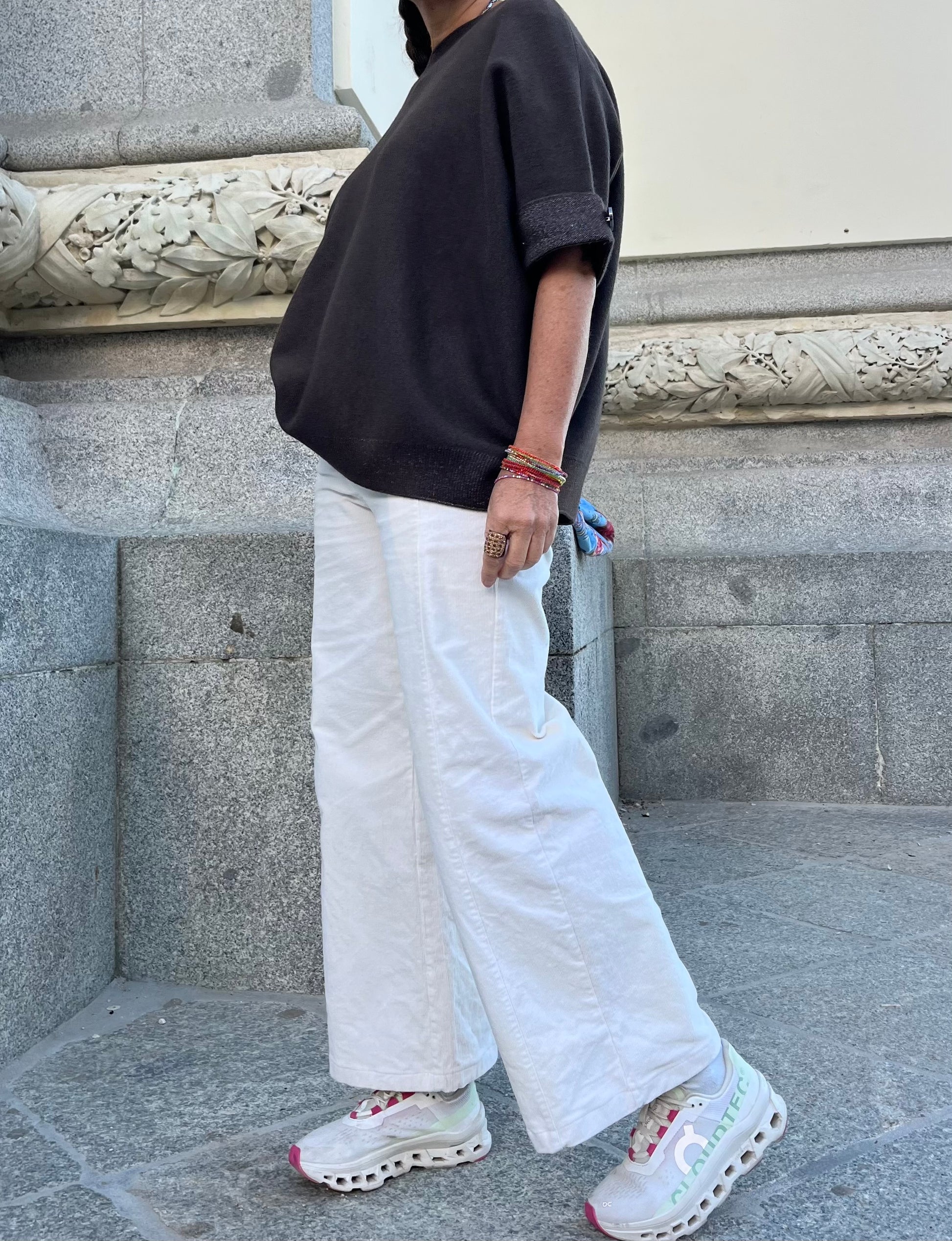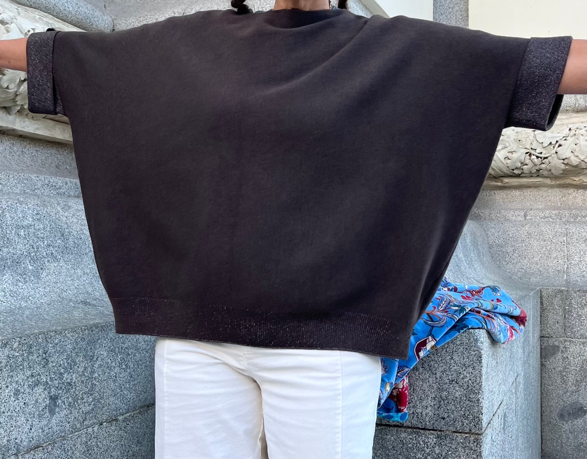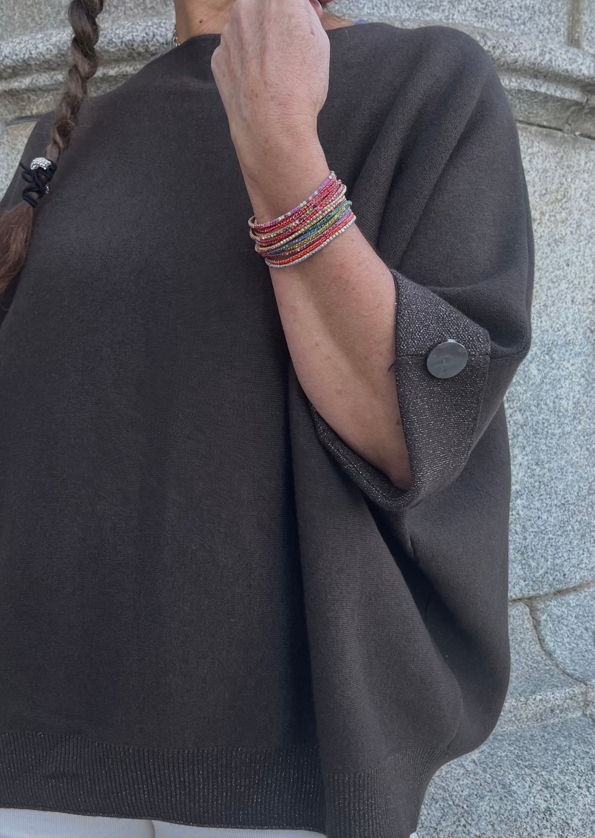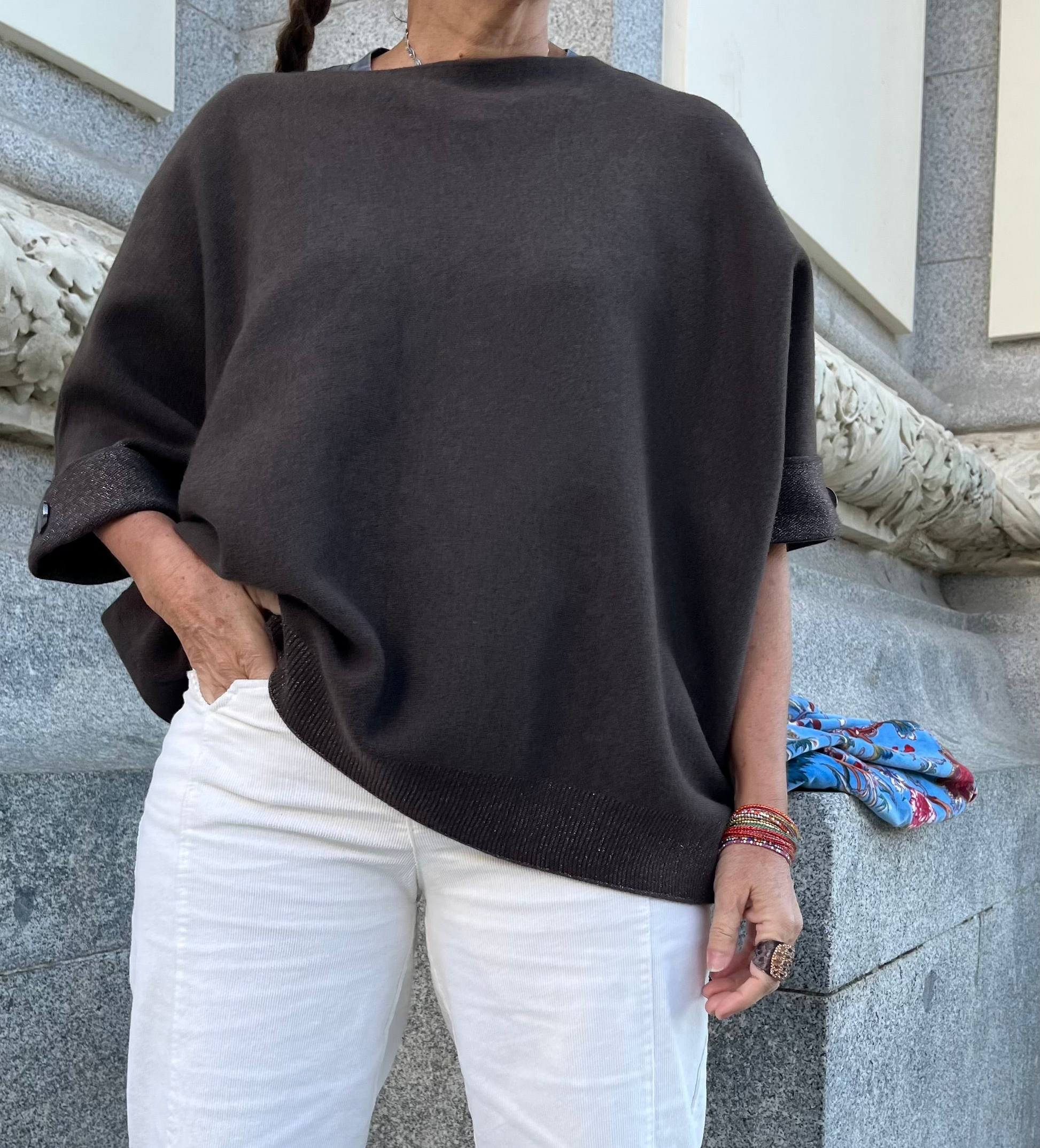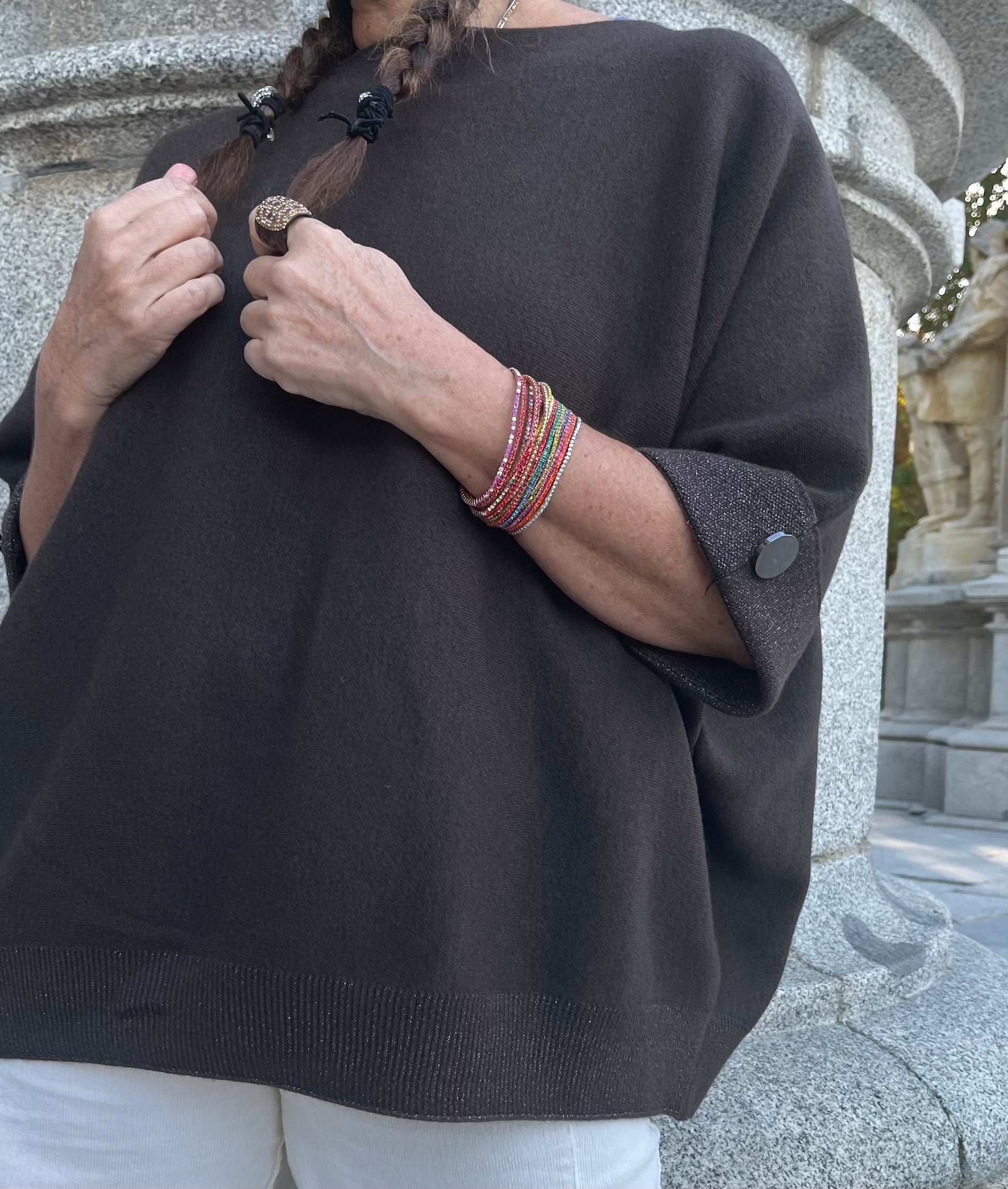 Jersey oversize de punto con cuerpo y tacto suave. Escote barco y manga caída tipo murciélago hasta el codo, rematada con vuelta fija y botón metálico. Bajo con ligero brillo (hilo metalizado también en el doblez de la manga). Silueta amplia, largo a la cadera.