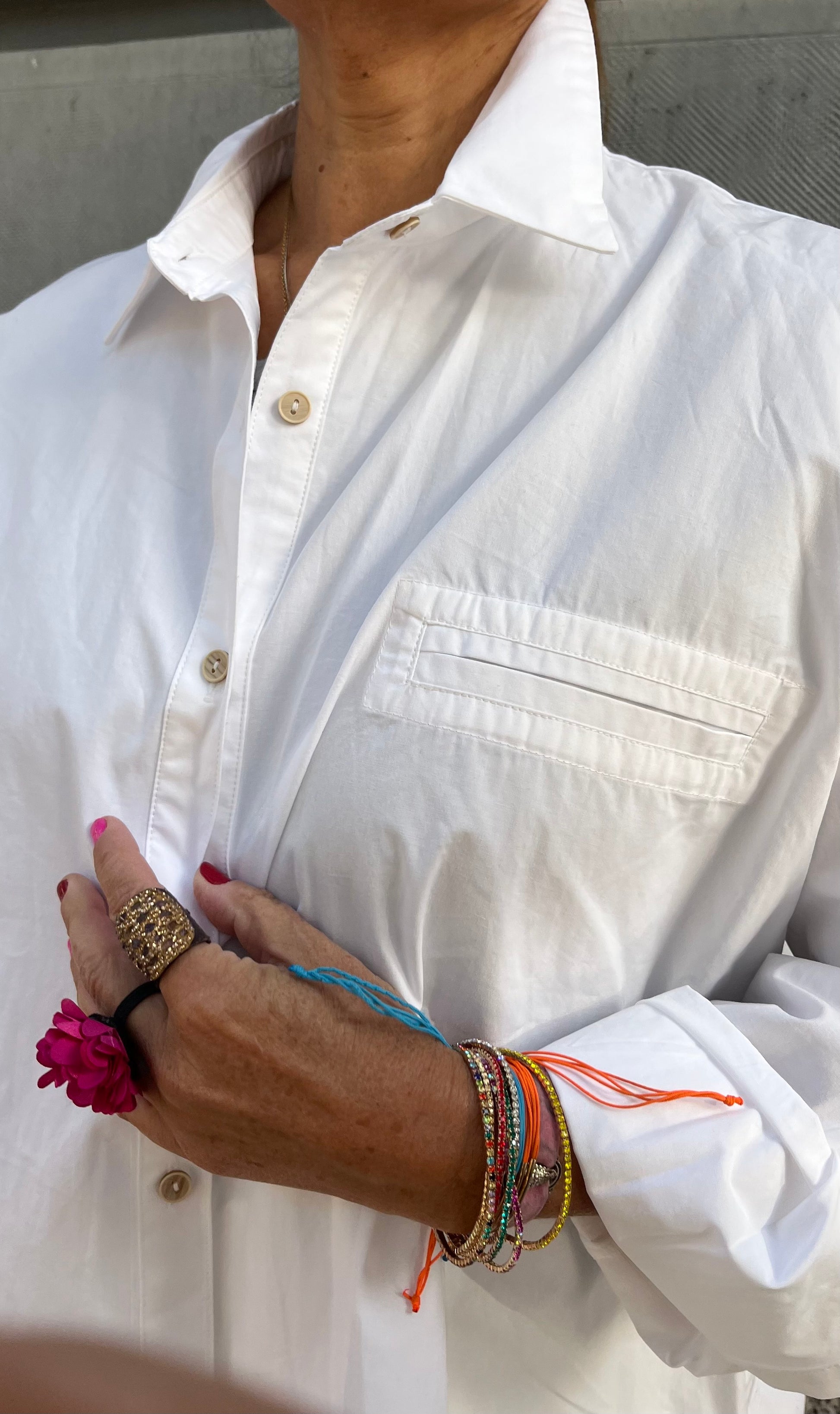 Puedes llevarla sola, abierta sobre camisetas o cerrada como pieza principal. Incluye bolsillo falso en el pecho y puños ajustables. Disponible en blanco y en un tono marrón cálido.