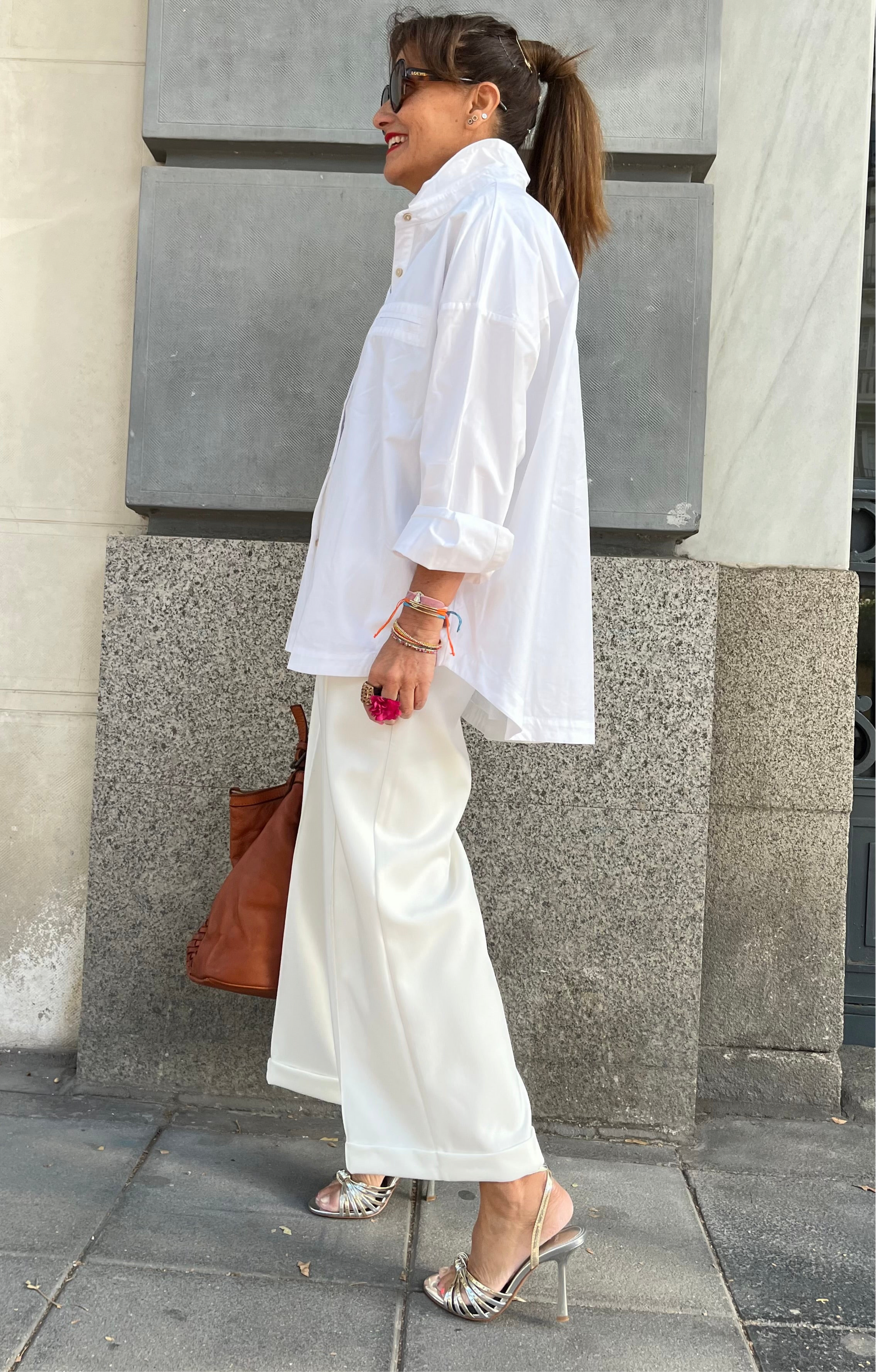Camisa amplia confeccionada en 100 % algodón, con cuello camisero y cierre frontal de botones. La espalda ligeramente más larga le da un aire tipo sobrecamisa con efecto gabardina.