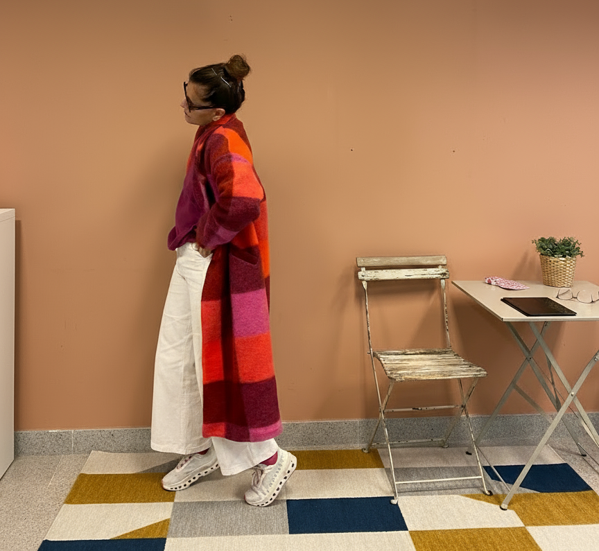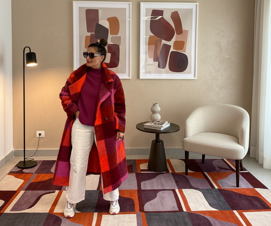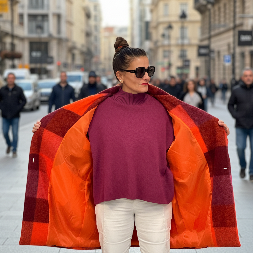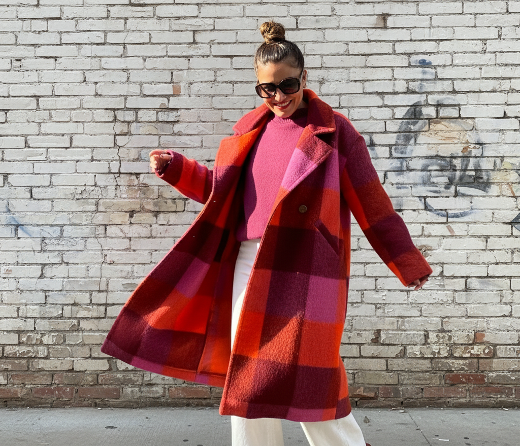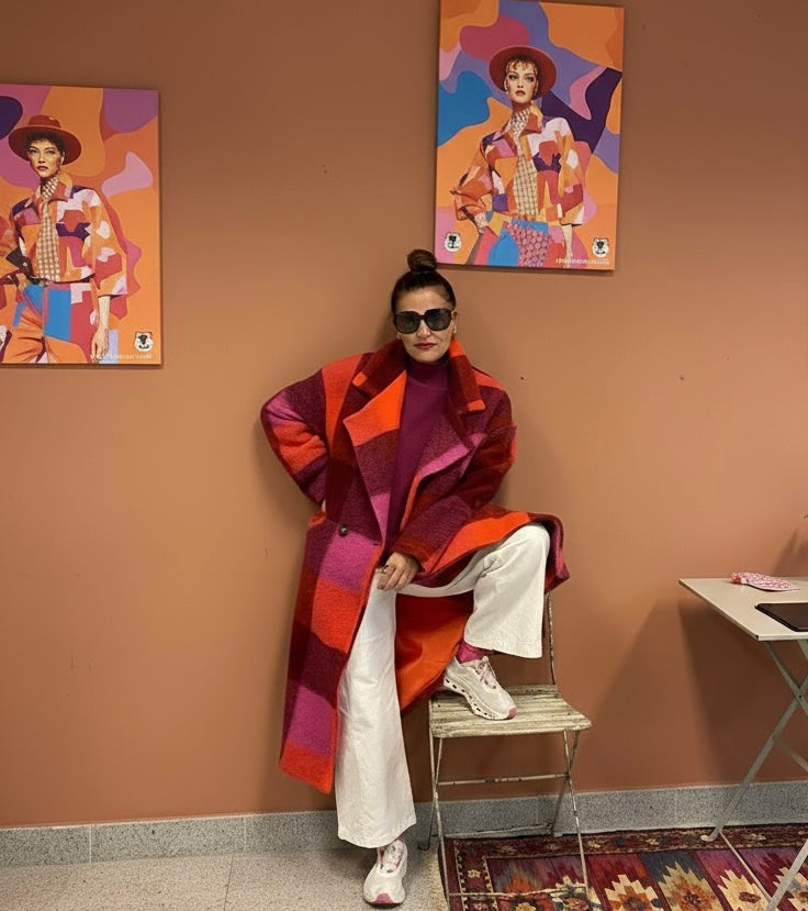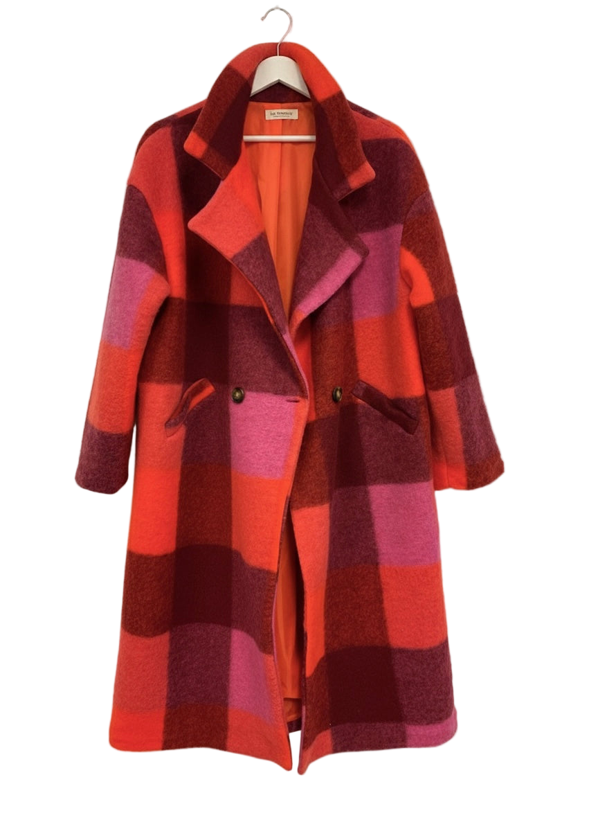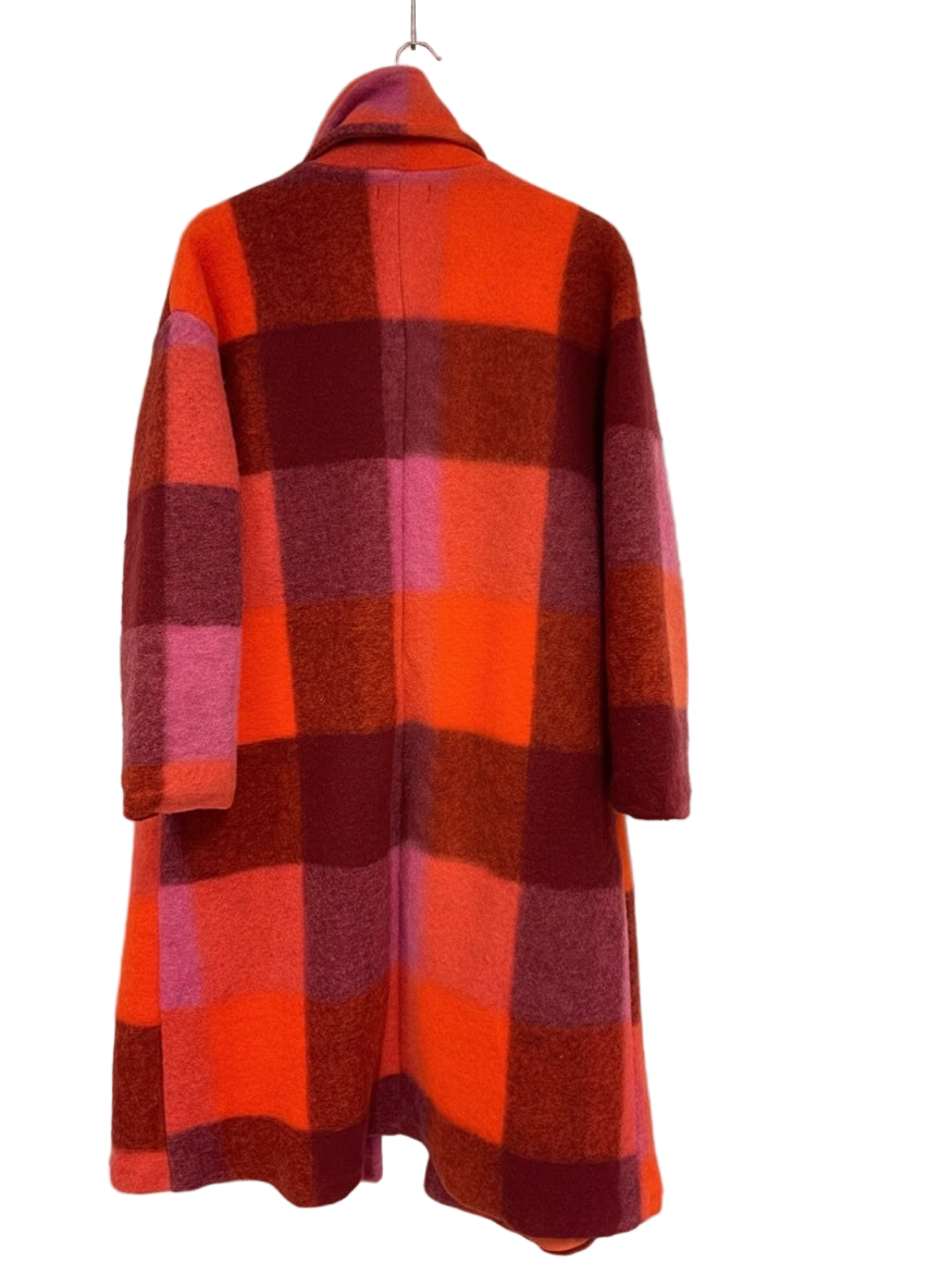 Abrigo largo con estampado de cuadros en tonos burdeos, fucsia, rosa y naranja. Exterior lana y forro interior completo en naranja. Corte recto, hombro caído y bolsillos laterales. Cierre frontal con dos botones.