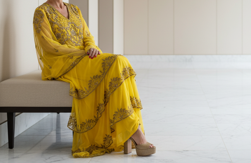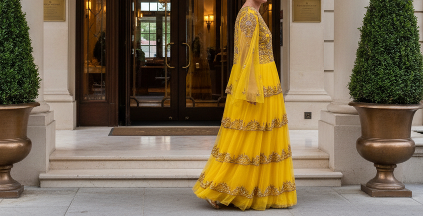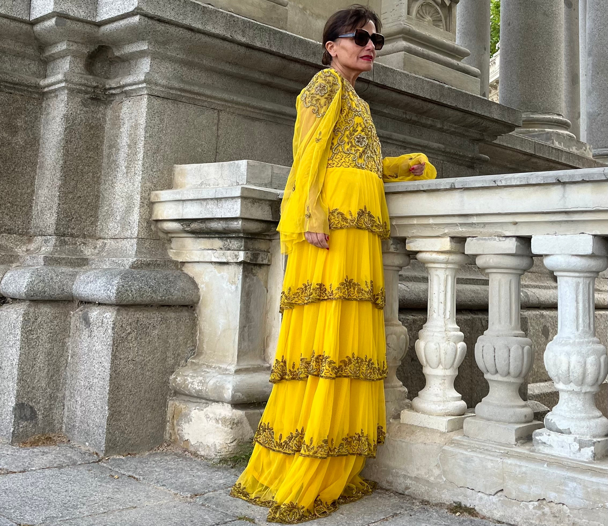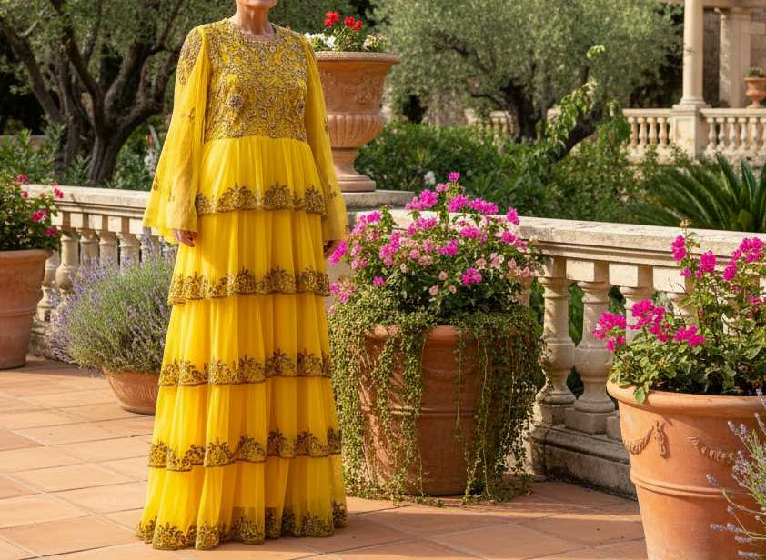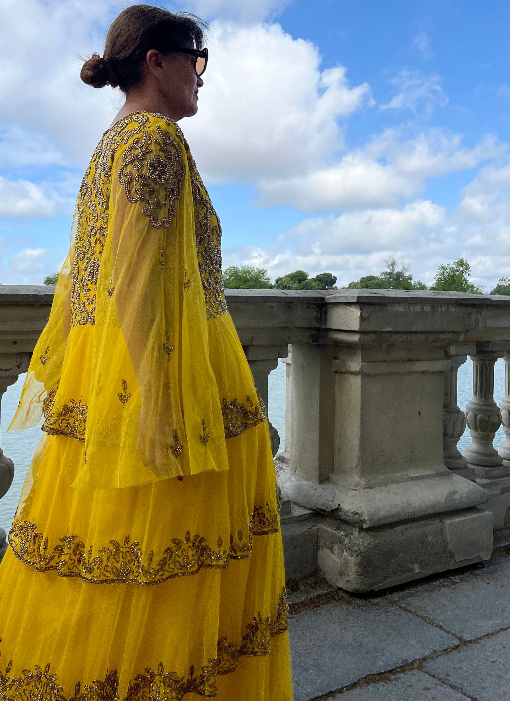 Vestido en tul bordado a mano, ligero y vaporoso, decorado con hilos dorados y pedrería que realzan cada detalle. Su color amarillo brillante es sinónimo de alegría y optimismo, perfecto para destacar en cualquier ocasión especial.